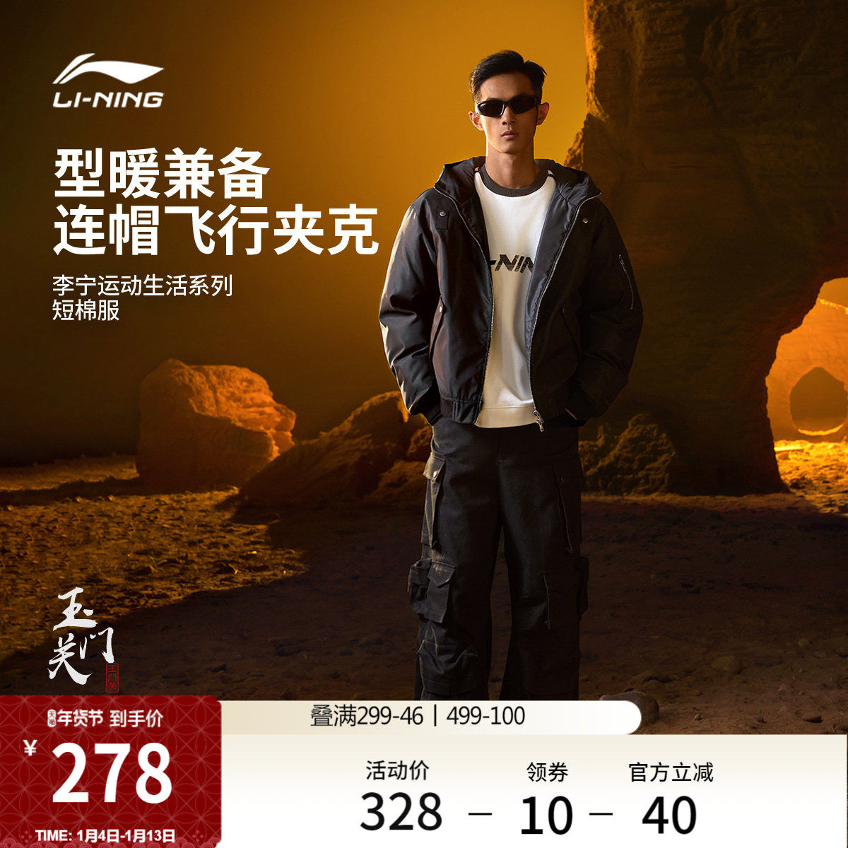 李宁飞行夹克男冬季官方新款情侣连帽加厚上衣休闲外套运动棉服女