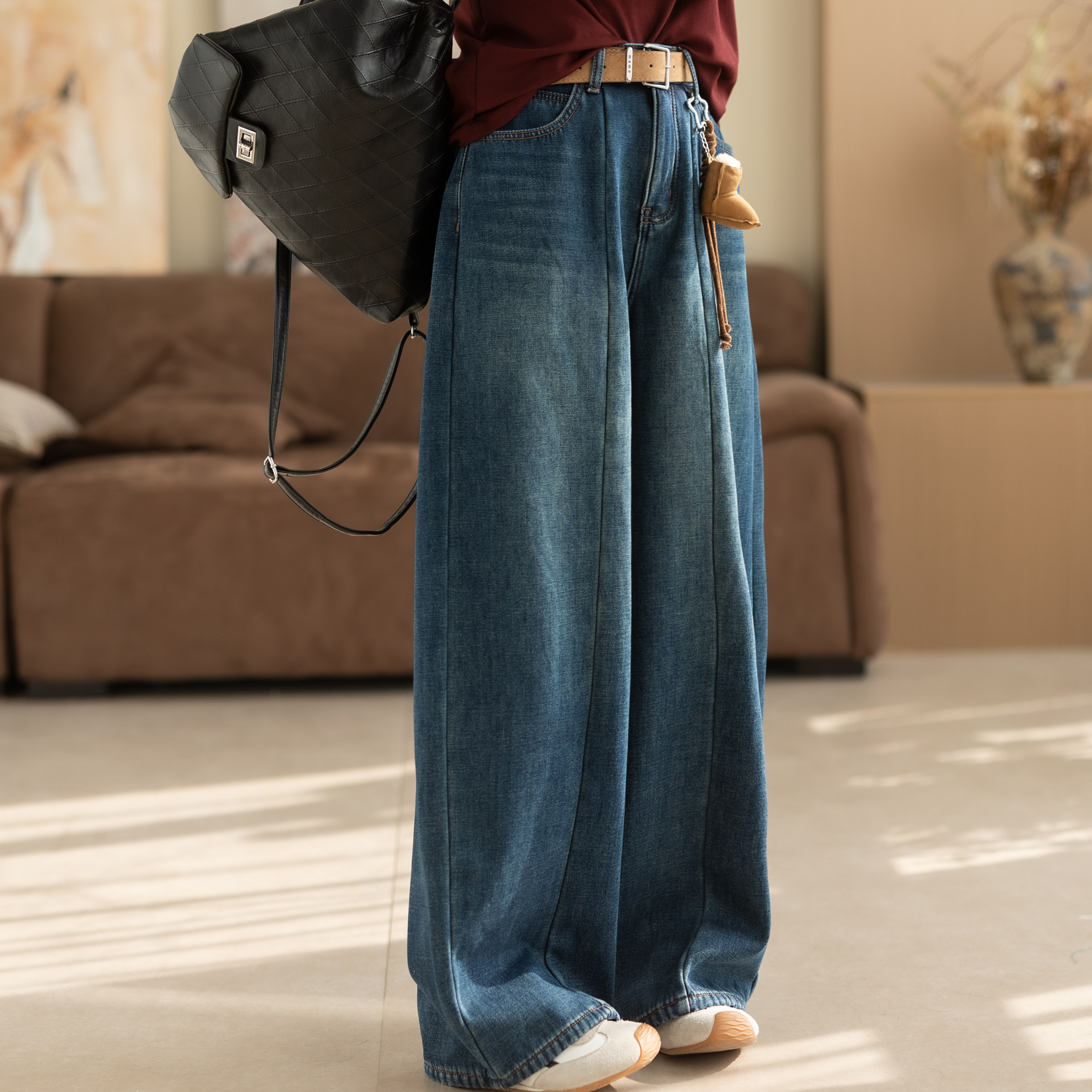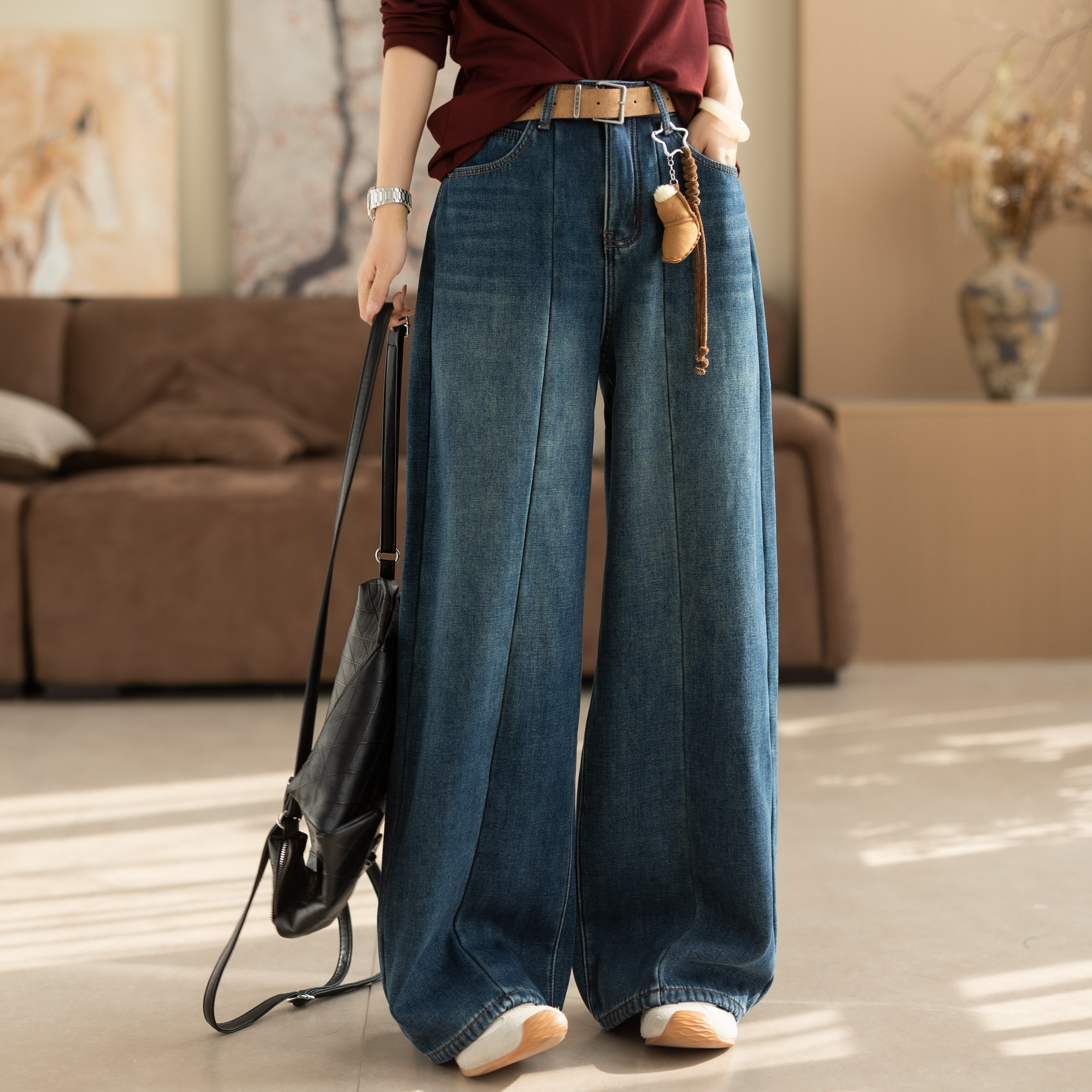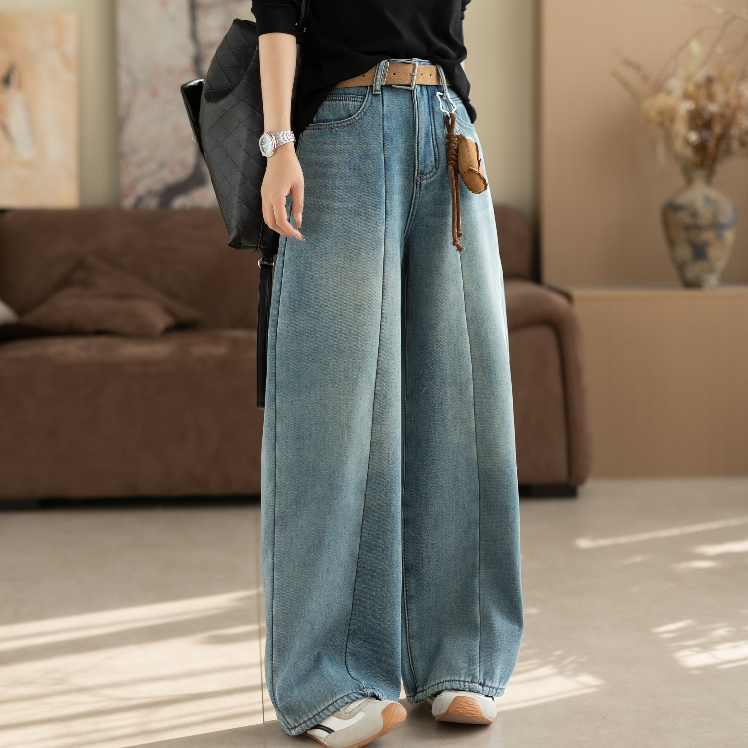 王家有鱼秋冬新款加绒阔腿裤2025百搭修身显瘦宽松直筒牛仔裤子女