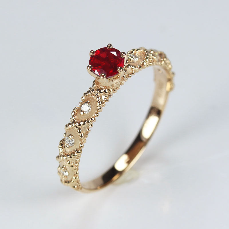 18k玫瑰金天然鸽血红宝石复古戒指 黄金花藤钻石女茜茜公主女款戒