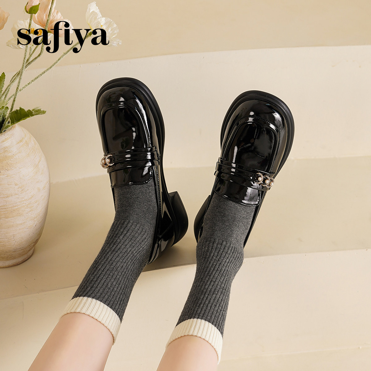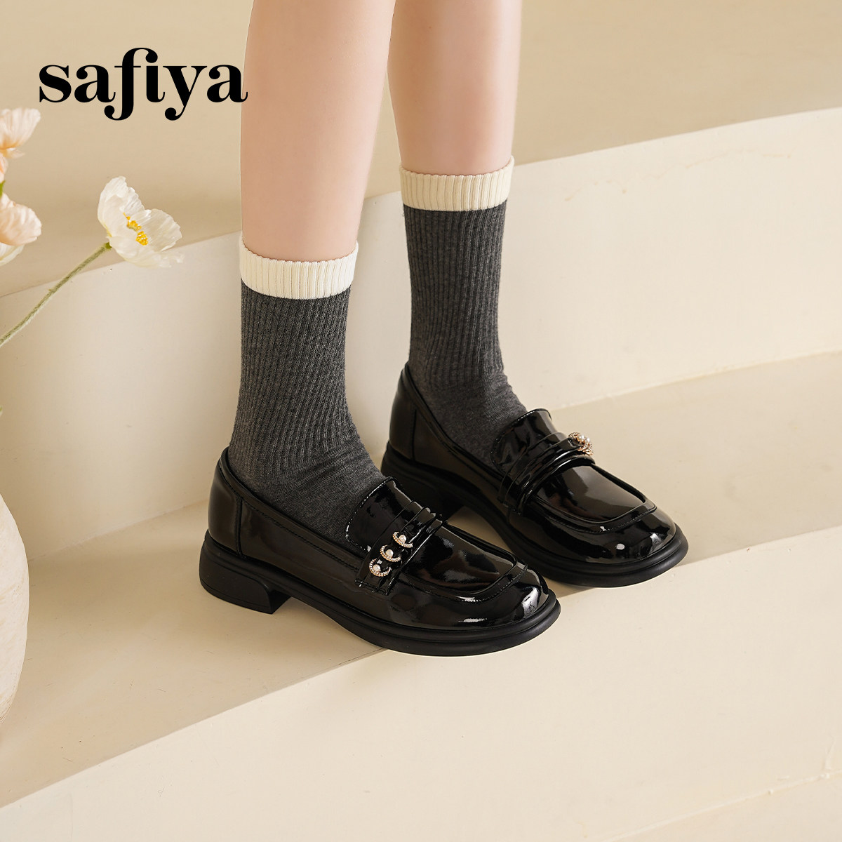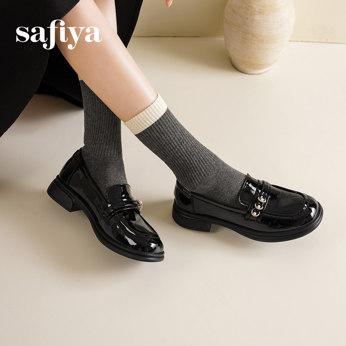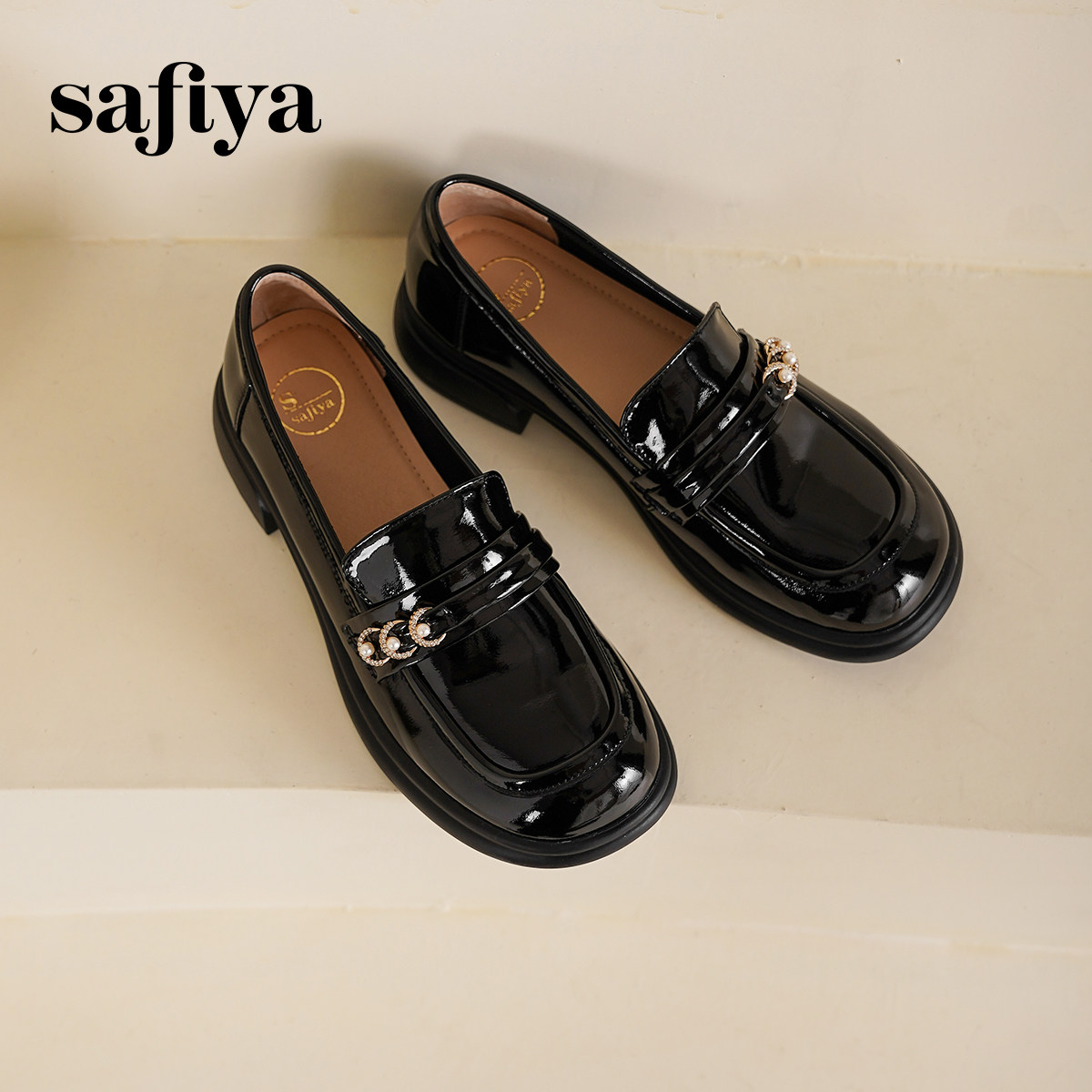 Safiya索菲娅2025春甜美英伦风漆皮粗跟小皮鞋乐福鞋女单鞋一脚蹬