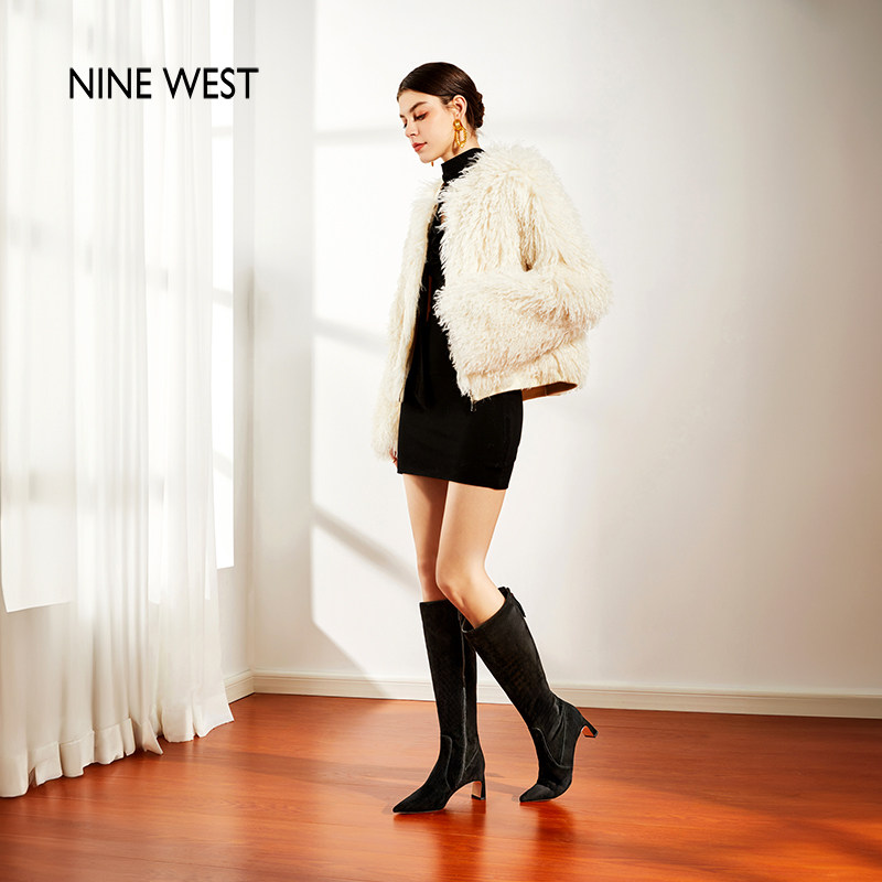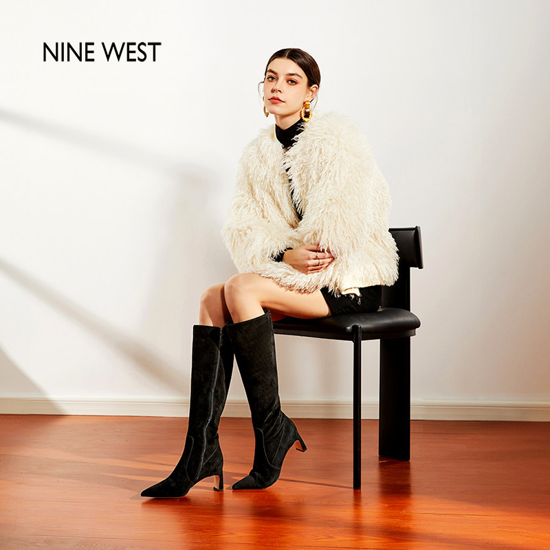 Nine West/玖熙尖头长筒靴女冬新款高跟弹力靴黑色气质保暖加绒