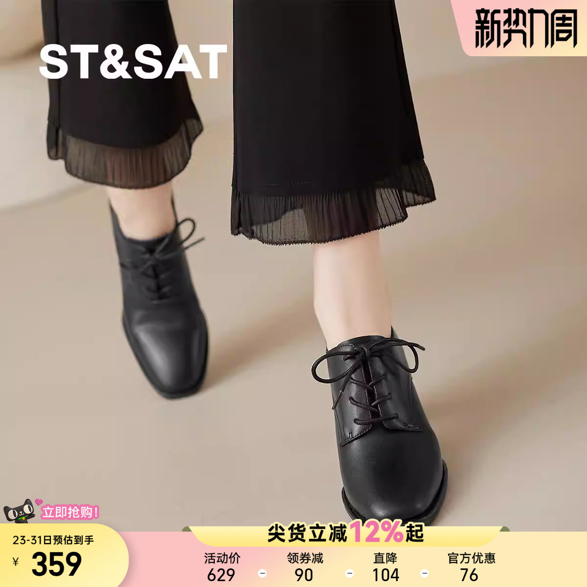 星期六女鞋粗跟2025超火单鞋妈妈鞋单鞋方头系带通勤鞋中跟不累脚