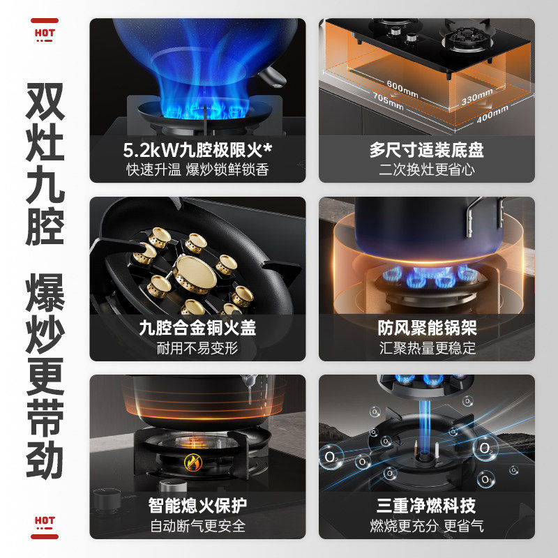 双灶九腔 5.2KW猛火 防风炉头可拆易清洁