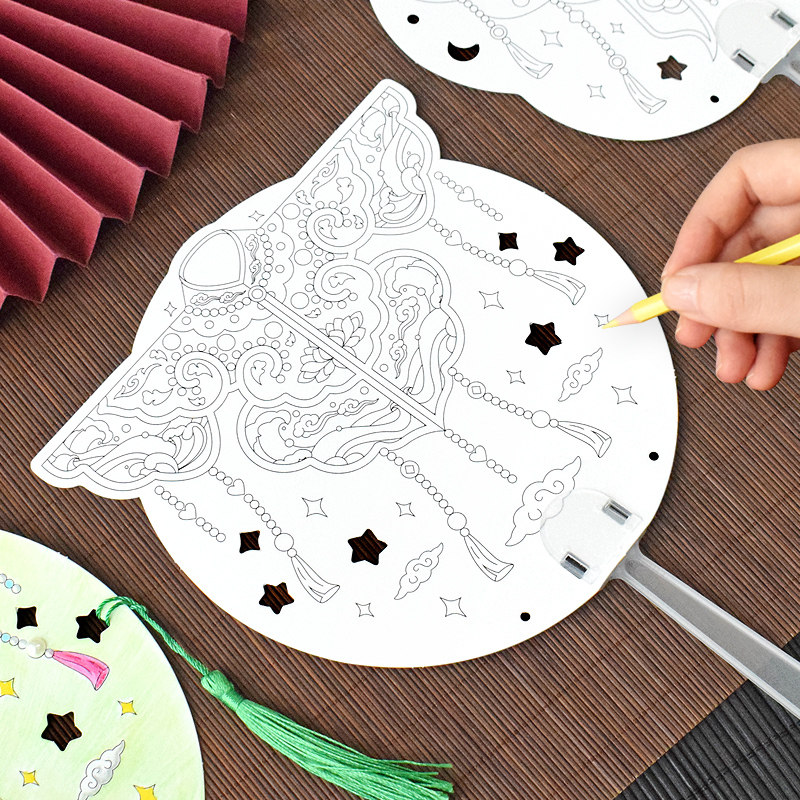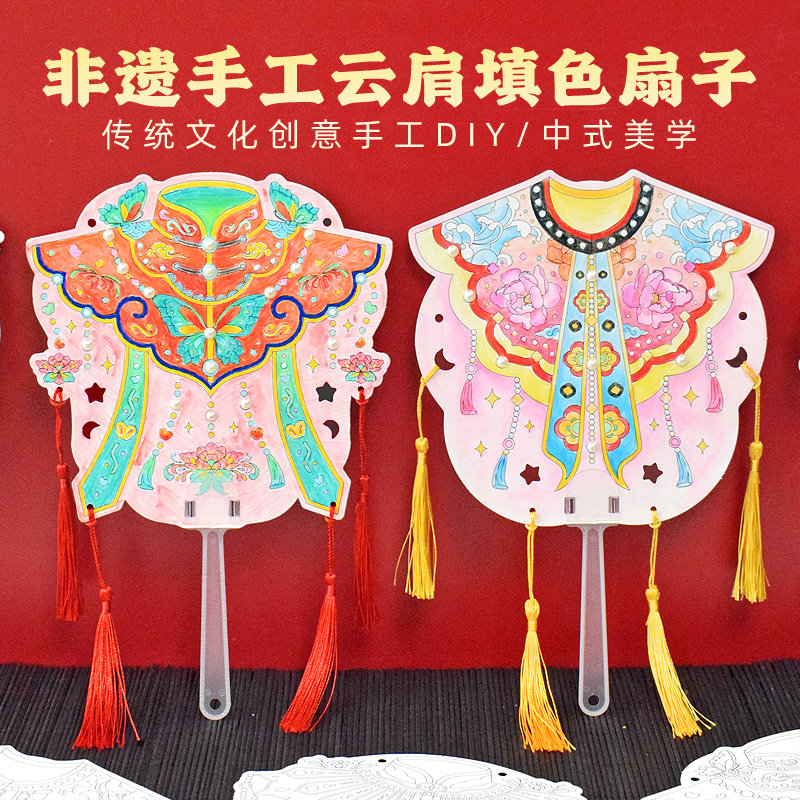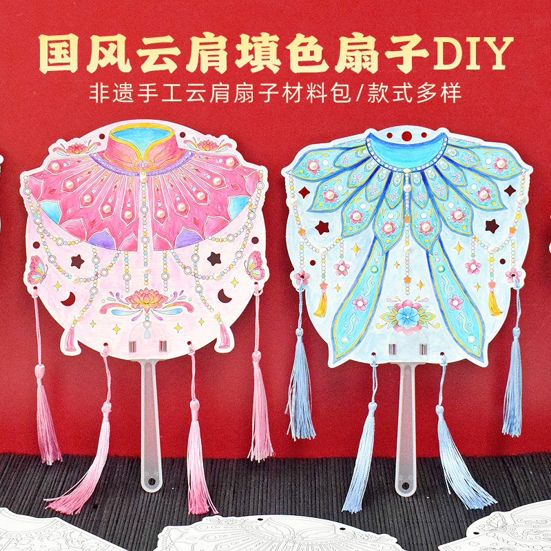国风云肩填色团扇子手工DIY材料包半成品空白纸质线稿手绘画非遗珍珠贴画小学生儿童创意美术涂鸦亲子活动