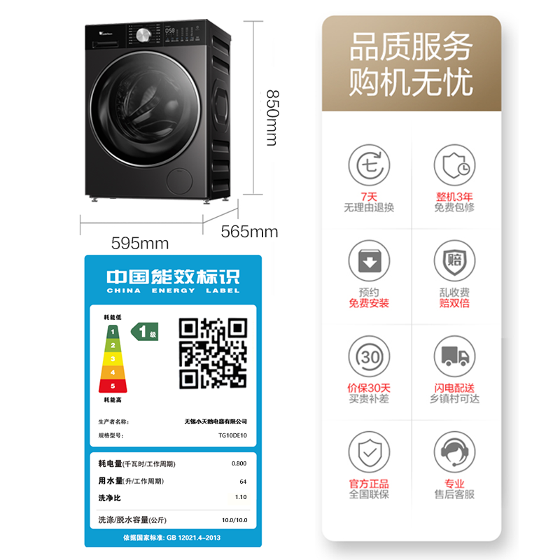 [纯平全嵌]小天鹅小乌梅3.0轻享版10KG全自动滚筒变频洗衣机E10