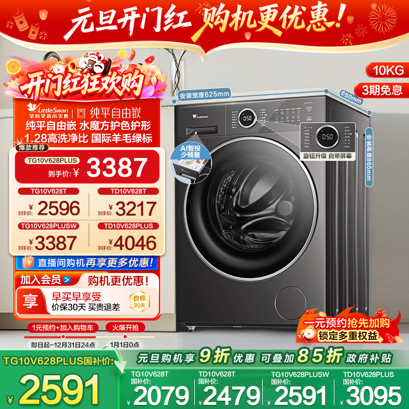 [纯平自由嵌]小天鹅洗衣机10KG家用水魔方滚筒洗脱一体628T/PLUS