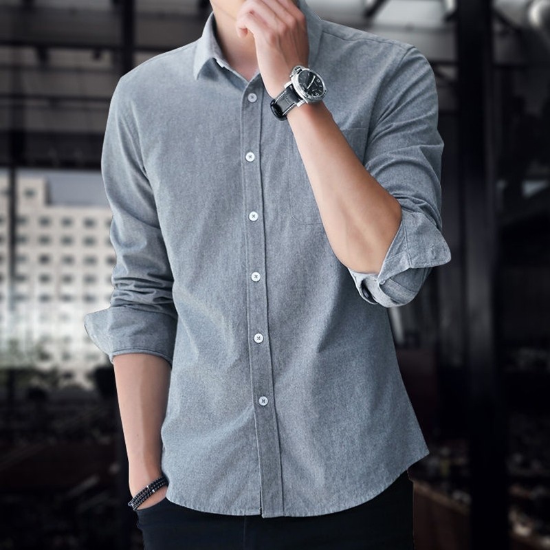 秋季棉质休闲衬衫男长袖韩版潮流帅气百搭牛津纺衬衣男士秋装外套
