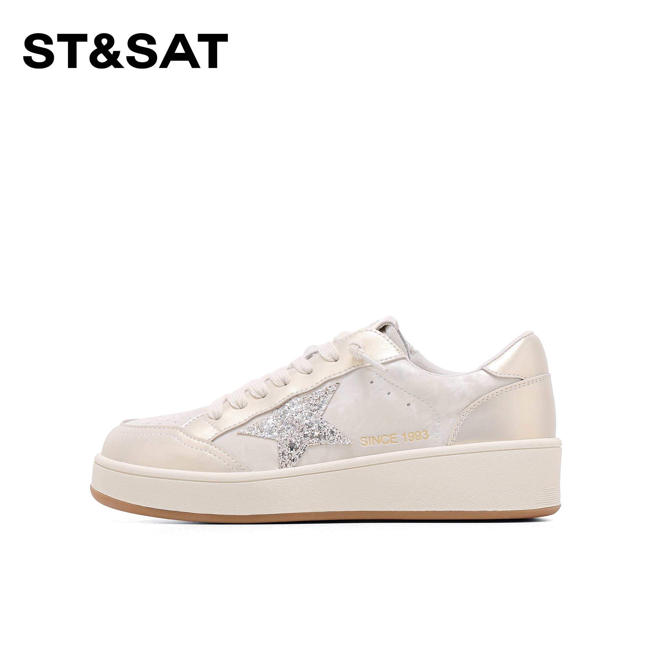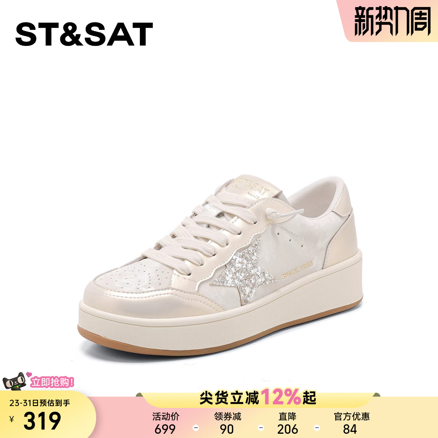 星期六简约小白鞋女2026新款春季星星亮钻皮面时尚百搭休闲板鞋爆