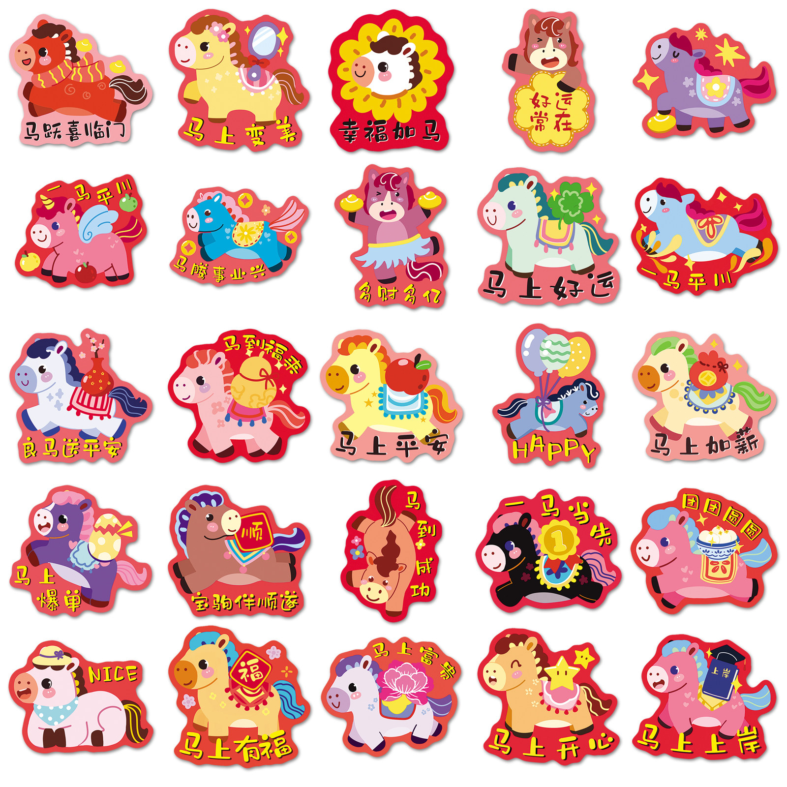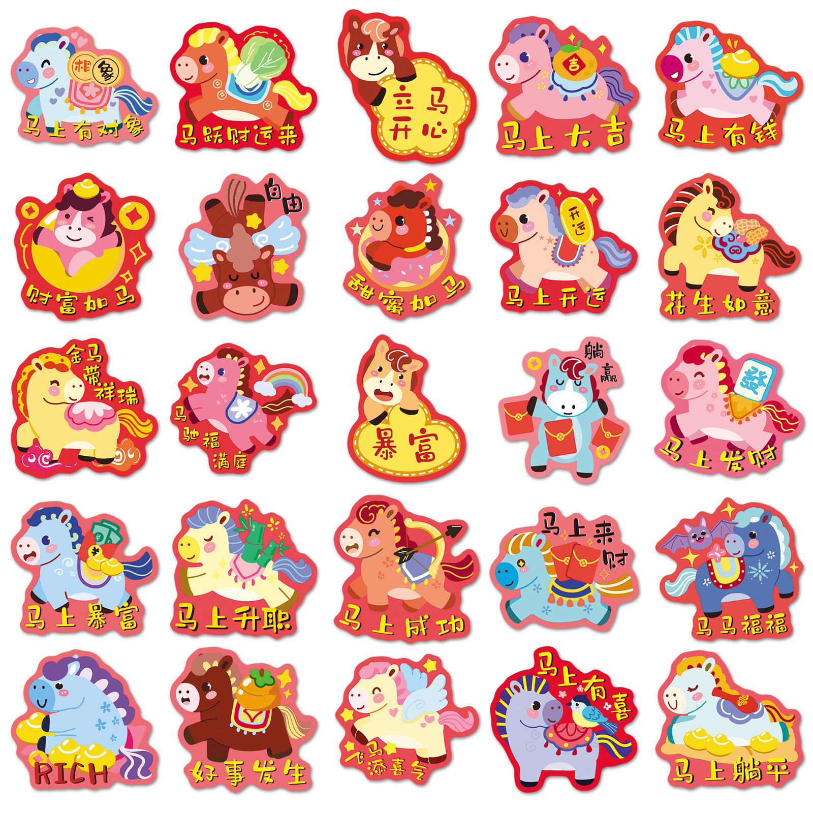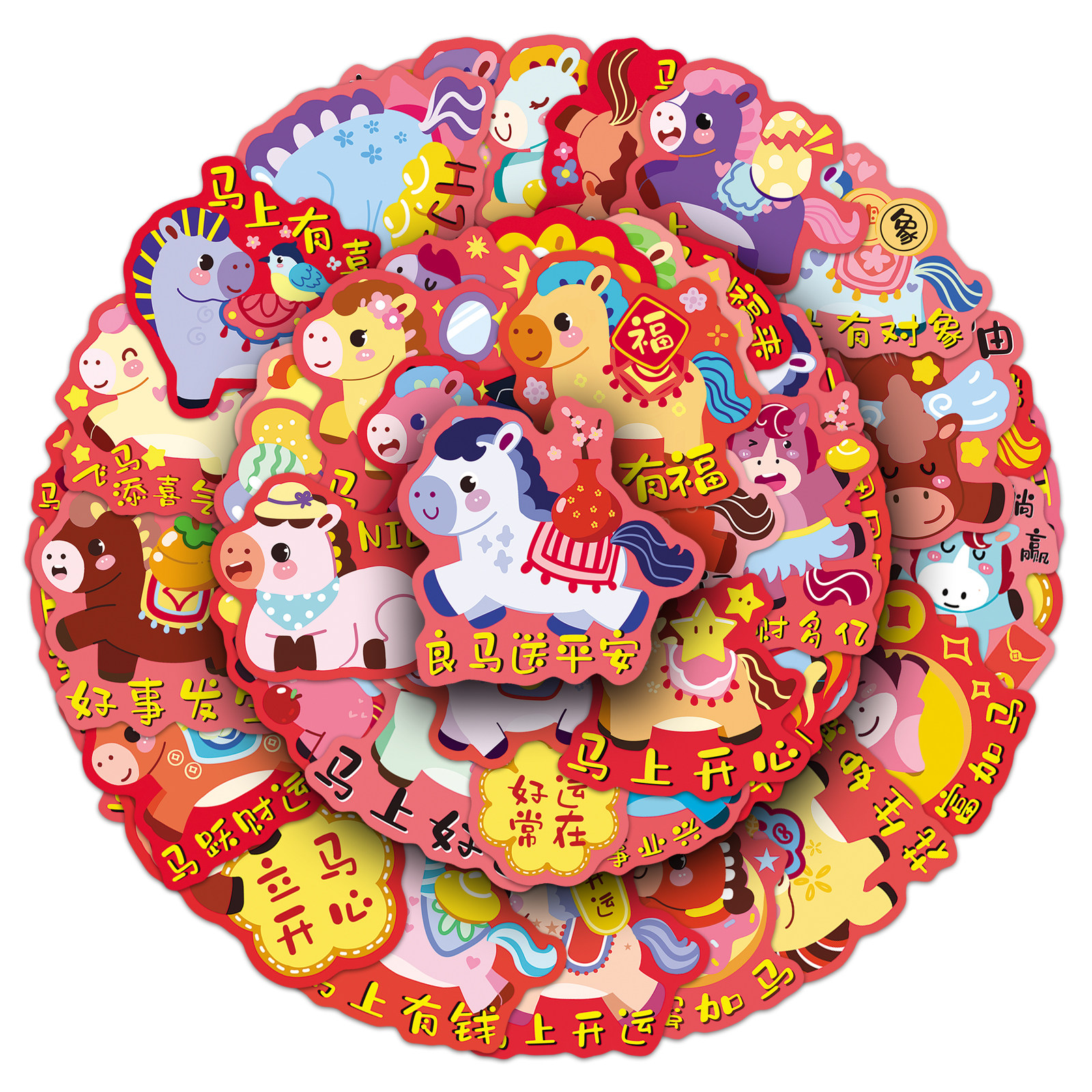 100张原创涂鸦新年马贴纸可爱卡通趣味学生diy装饰防水礼物盒子平板电脑滑板文具床头柜玻璃保温杯电动车贴纸