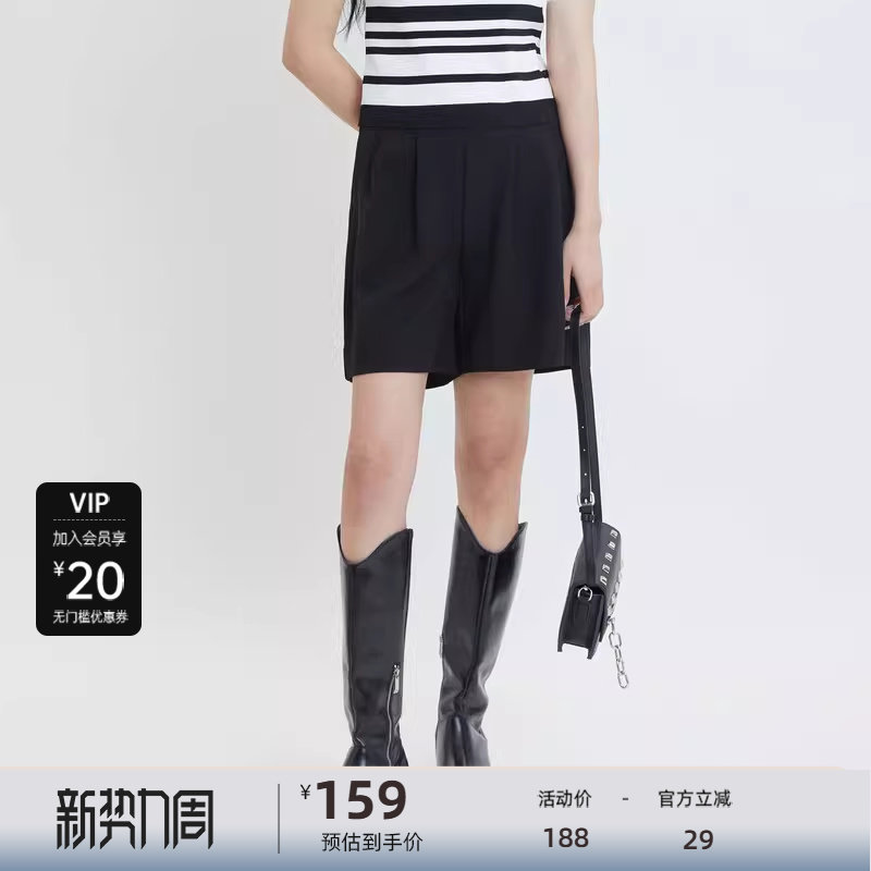 sdeer圣迪奥女装复古高腰压褶A字黑色短裤S24280904