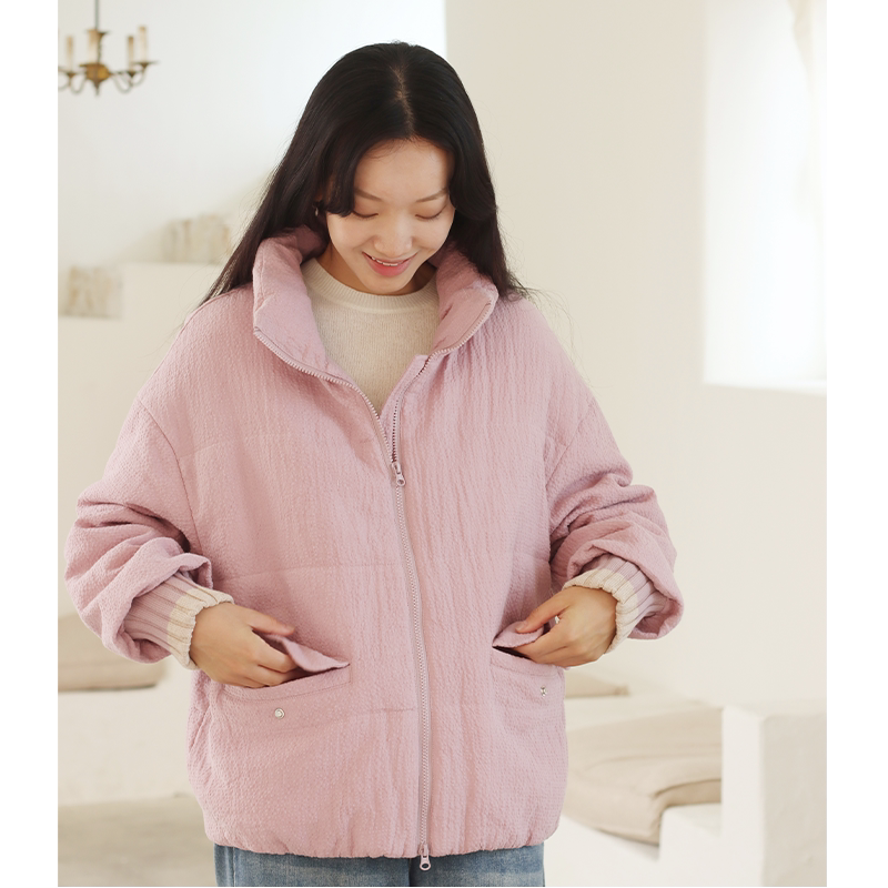 韩系甜美波点针织拼接长袖冬季棉服女宽松短款保暖加厚面包服外套