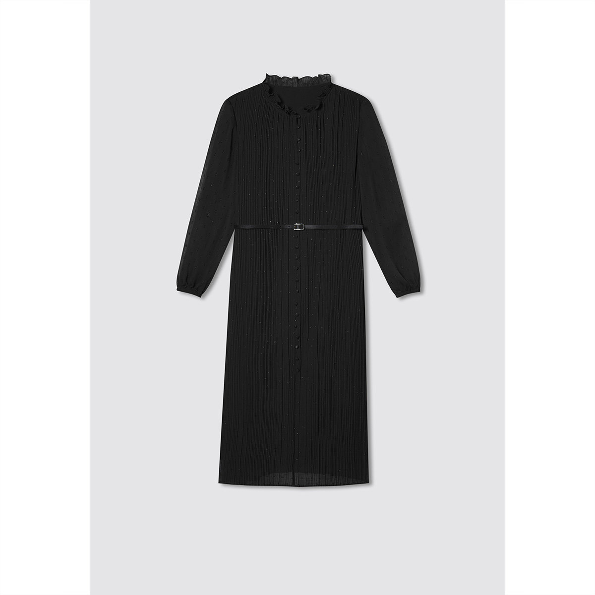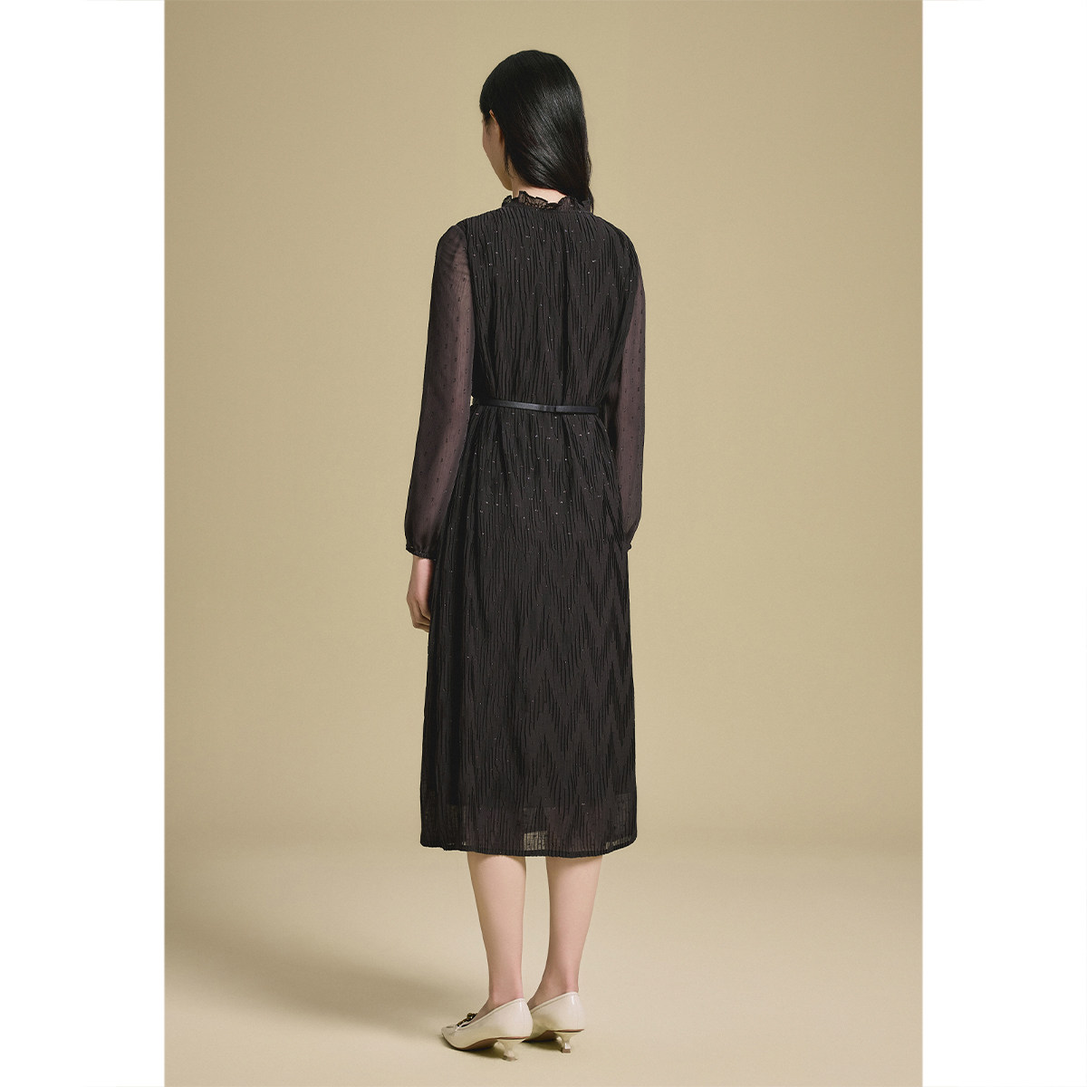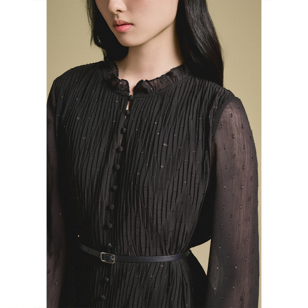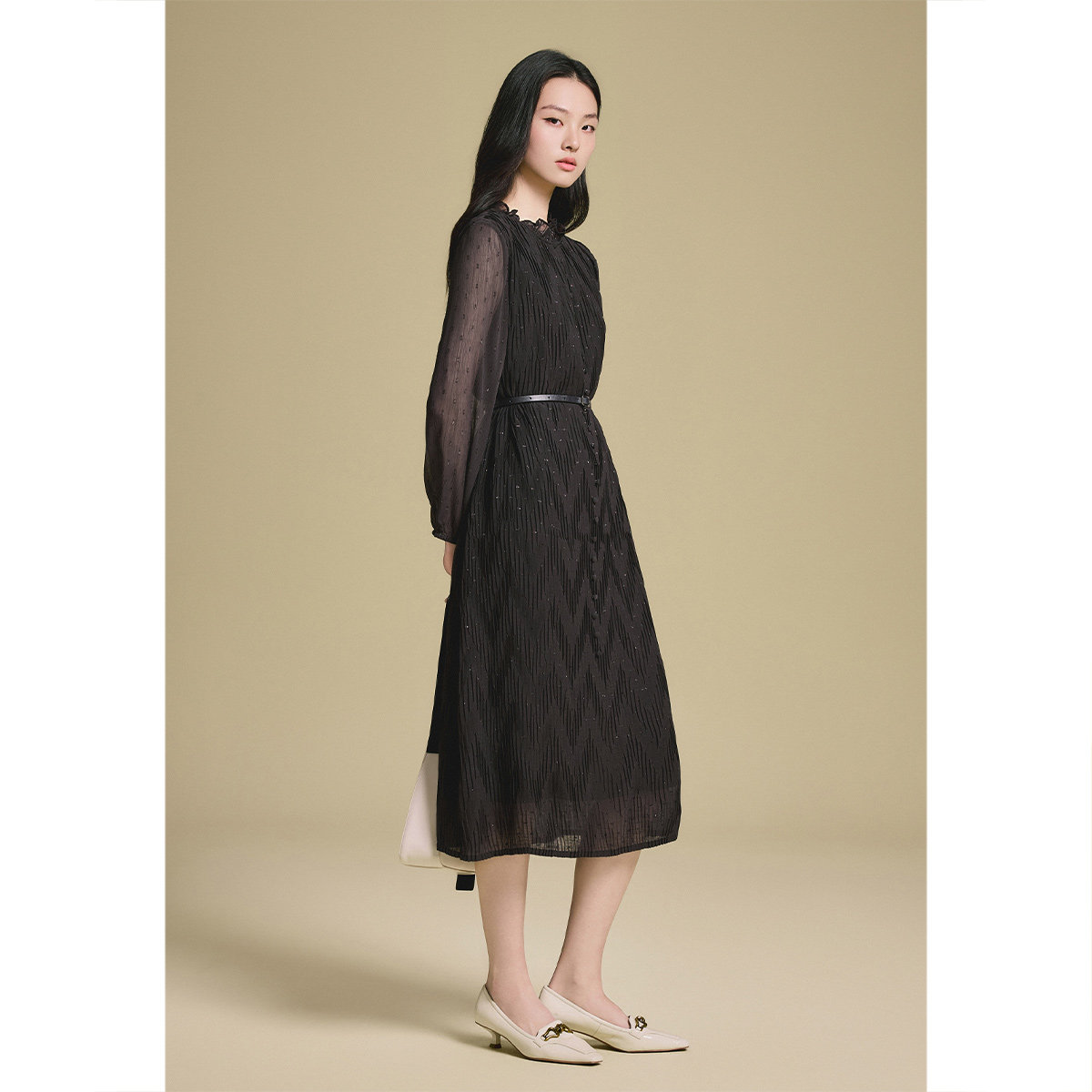 诗篇专选气质亮闪丝提花雪纺木耳边领几何压褶连衣裙2025春季新款