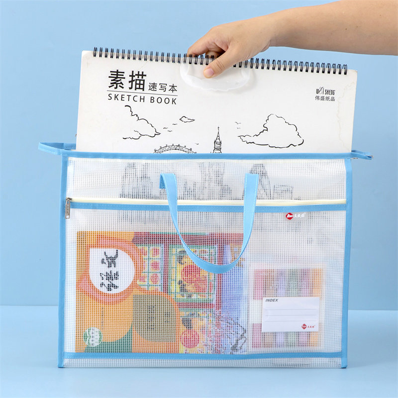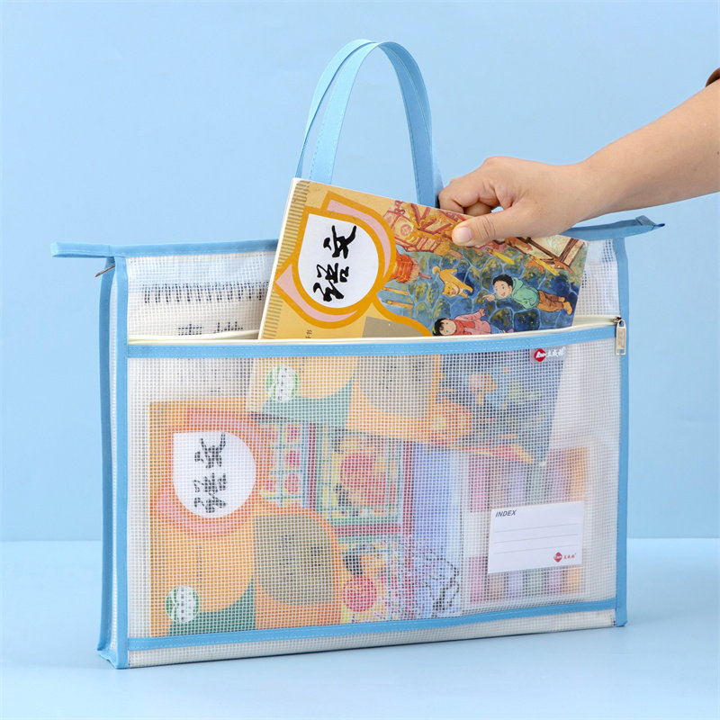 L型科目分类袋手提透明文件袋拉链式网纱大开口学生拎书袋考试