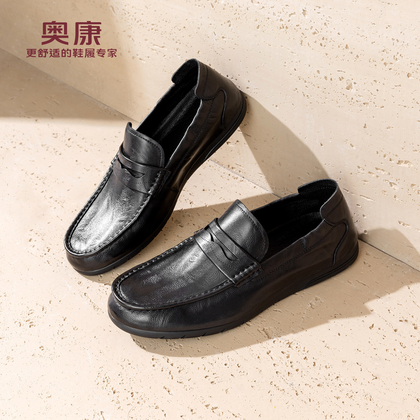 奥康春秋季商务休闲皮鞋男真皮软底乐福鞋舒适一脚蹬套脚爸爸鞋