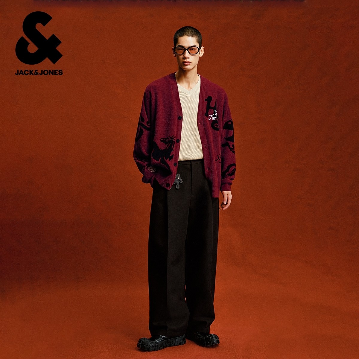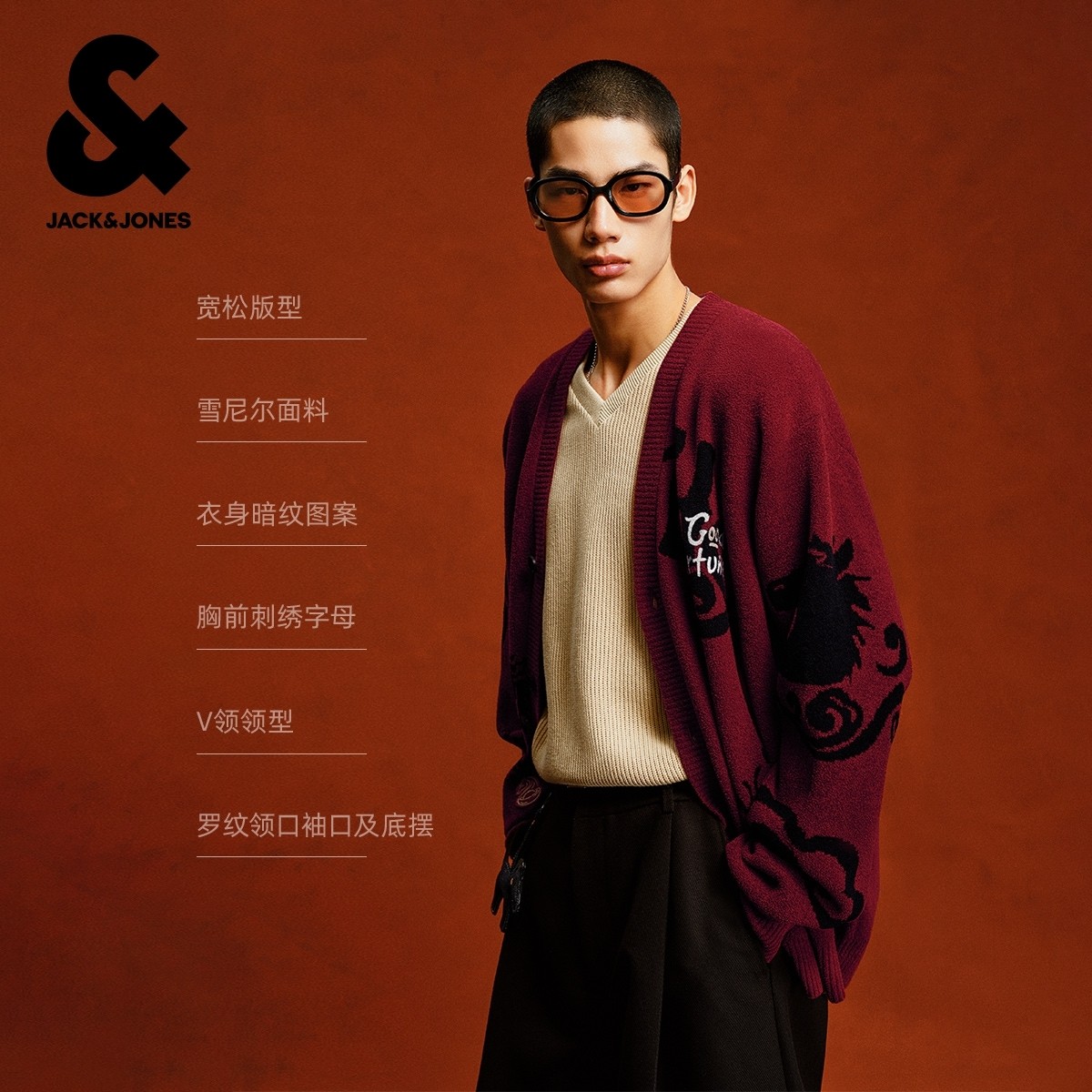 杰克琼斯奥特莱斯男装毛衣马年新年款暗纹刺绣宽松V领针织开衫