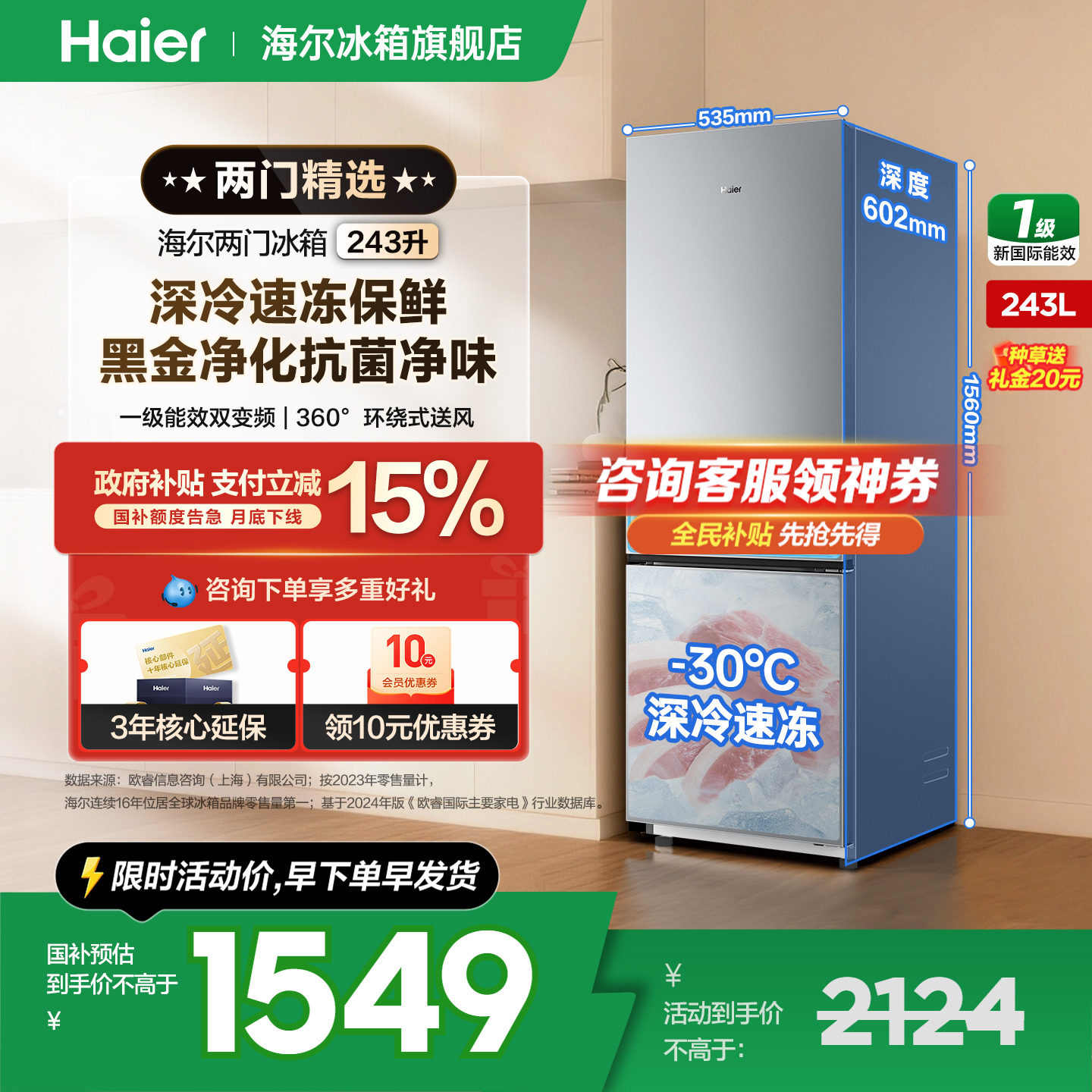 【国补告急】海尔冰箱243升上下双开门一级变频无霜小型官方正品
