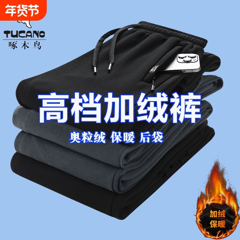 啄木鸟冬季休闲裤男士宽松直筒卫裤束脚长裤加绒加厚保暖运动裤子