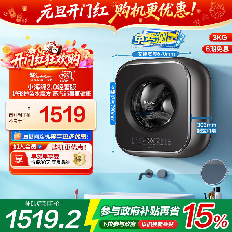 小天鹅小海绵2.0轻奢版3kg迷你洗衣机宝宝母婴儿童全自动壁挂M60
