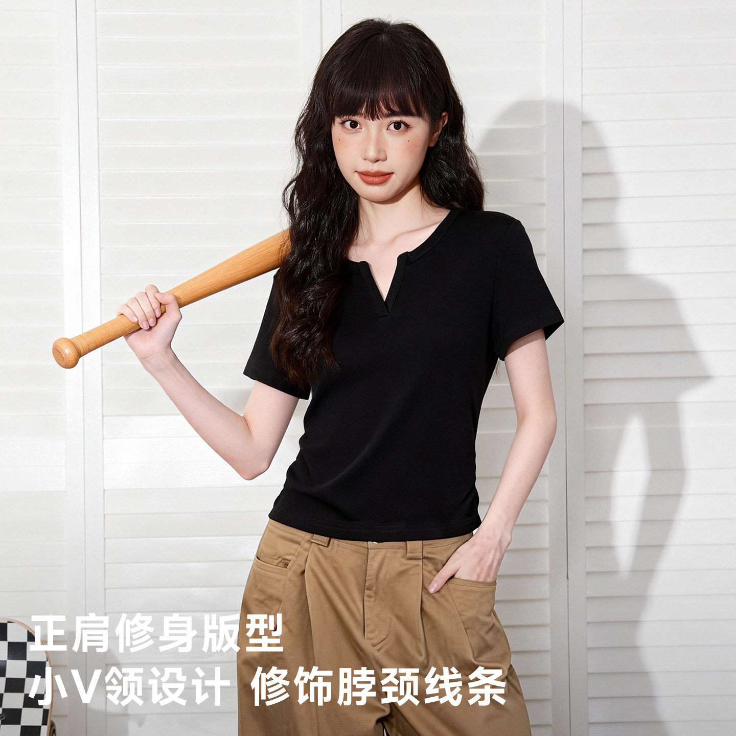 唐狮官方黑色短袖女t恤夏2026新款夏季短款修身显瘦半袖上衣女VB