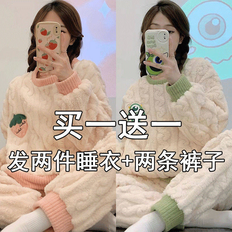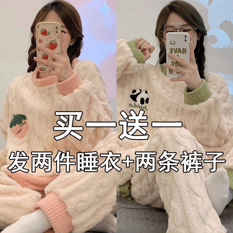 买一送一法兰绒毛绒冬珊瑚绒睡衣冬季女款加绒加厚秋冬款居家家居