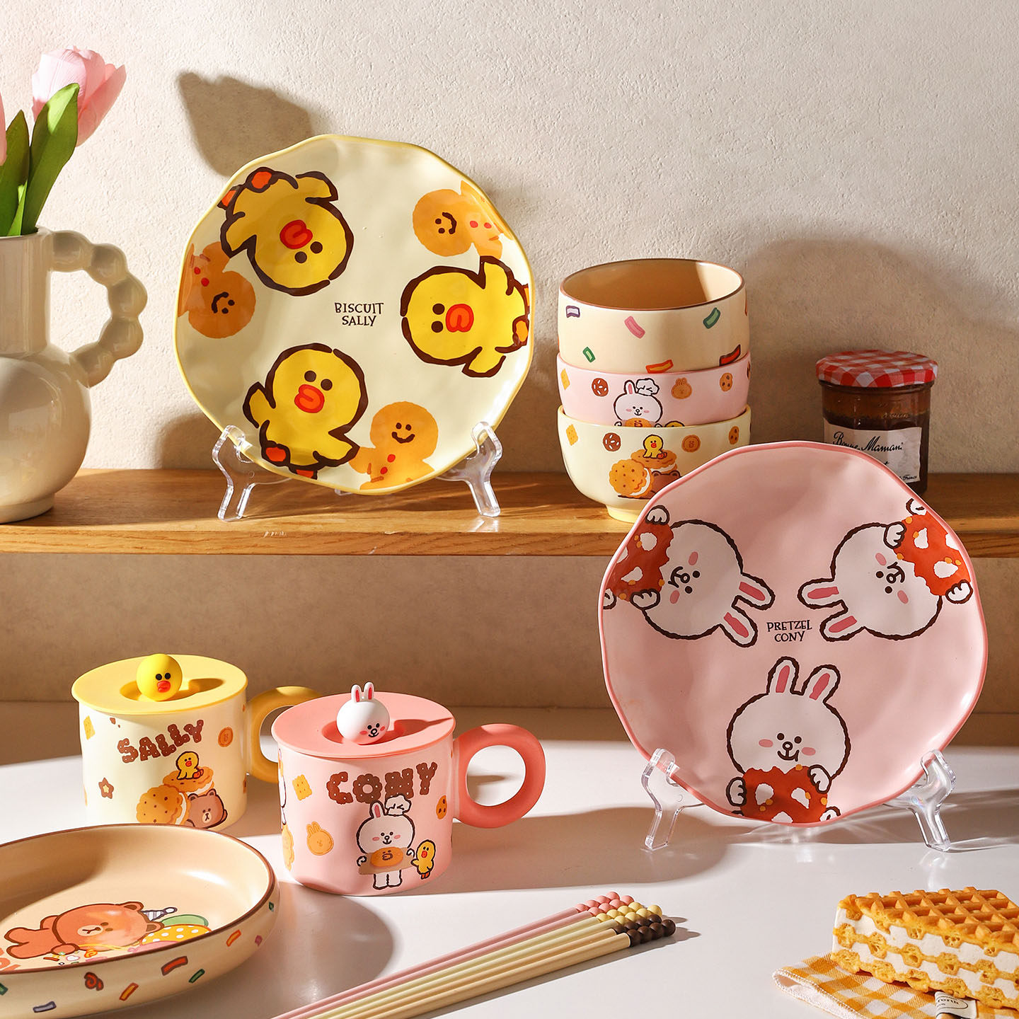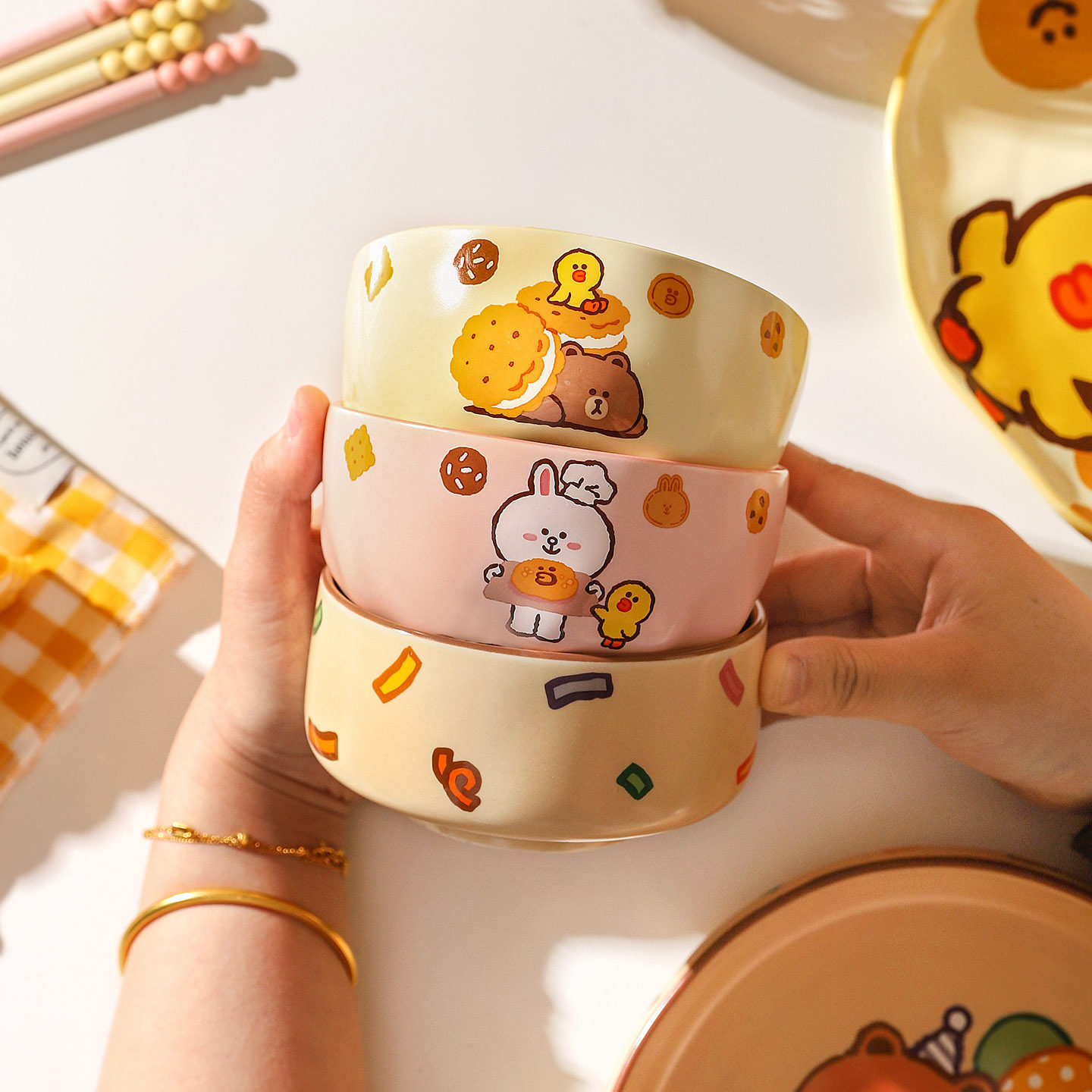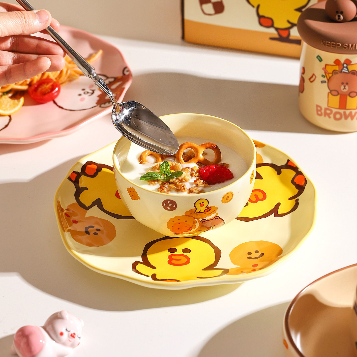 奶油风陶瓷碗家用卡通菜盘子可爱米饭碗汤碗釉下彩儿童餐具耐高温