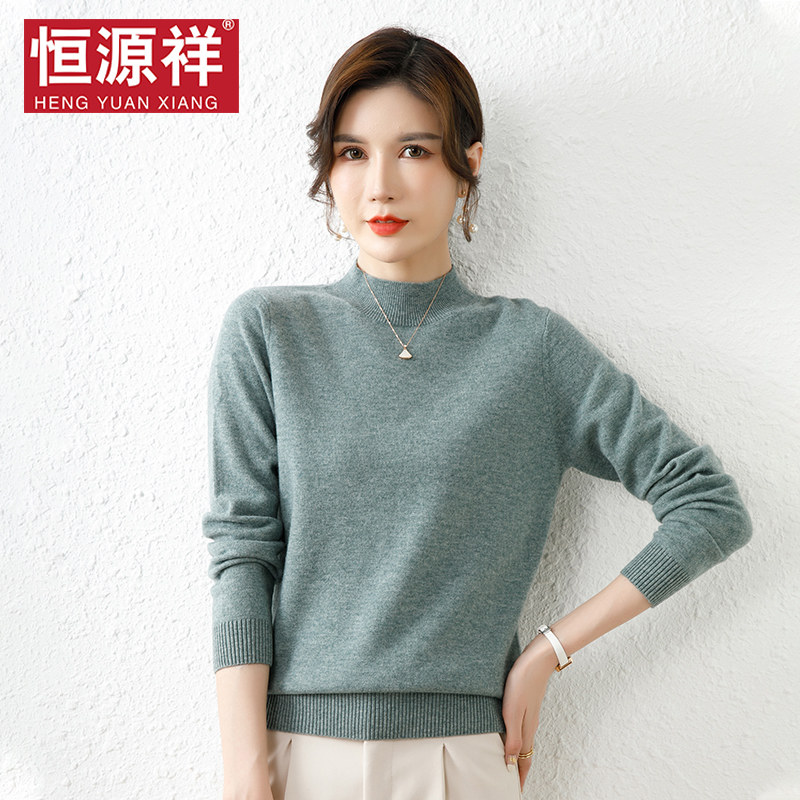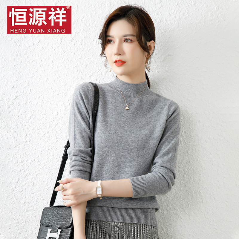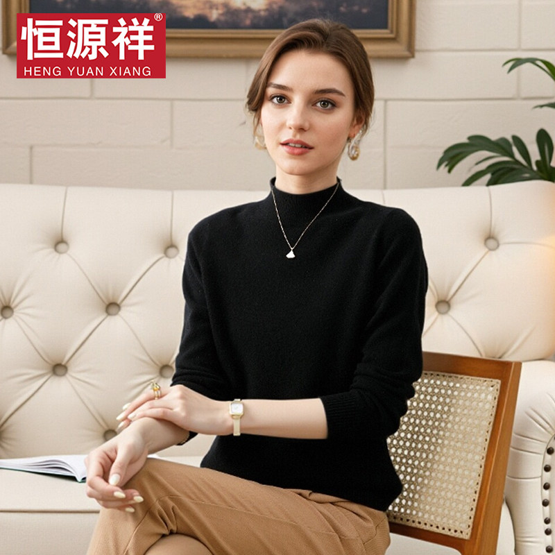 恒源祥半高领针织衫女纯羊毛衫秋冬无羊绒纯黑色套头内搭打底毛衣