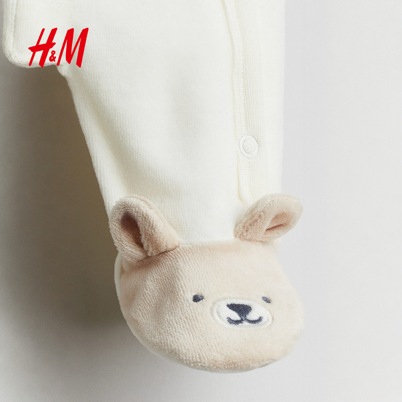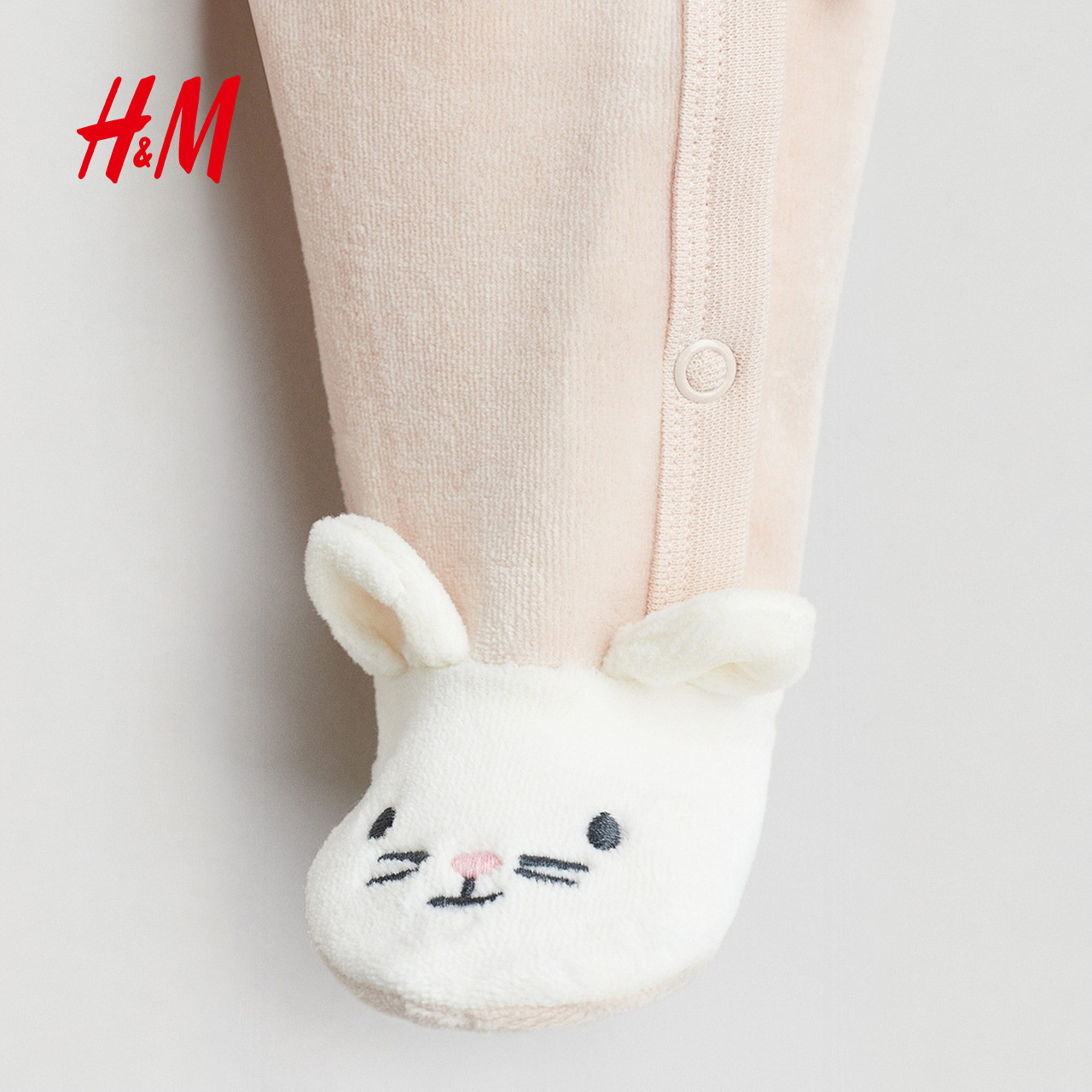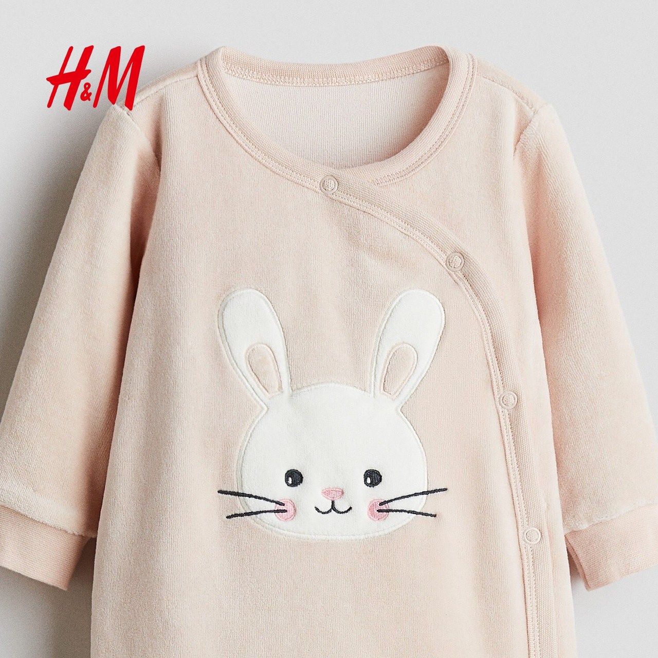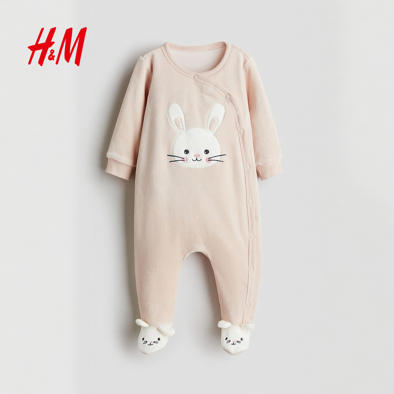 HM童装婴儿男婴女婴2025年冬季新款圆领丝绒包脚连体睡衣1200652