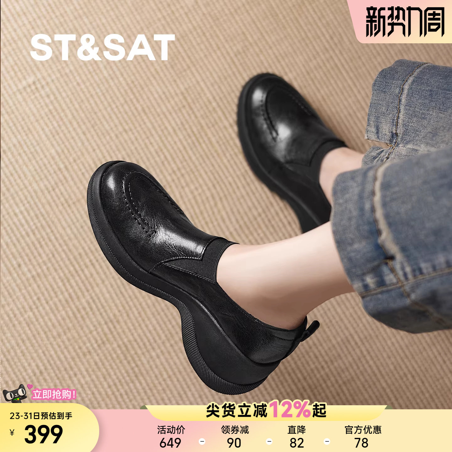 星期六真皮厚底乐福鞋女2026春新款黑色坡跟小皮鞋一脚蹬深口单鞋