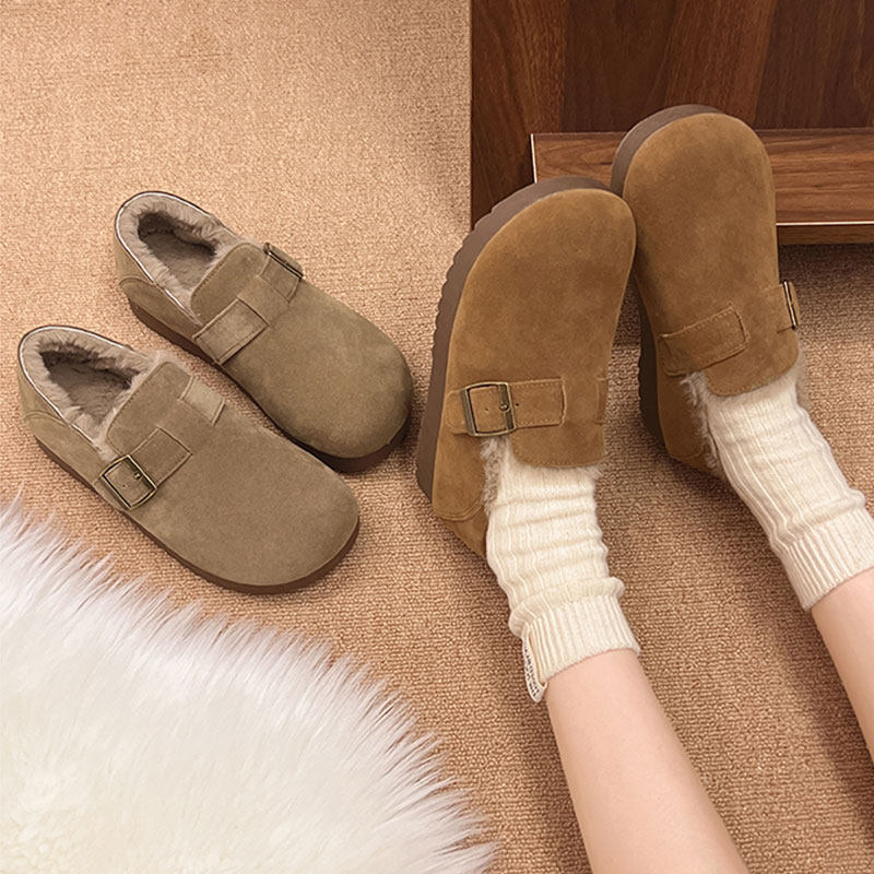TATAFOCUS~加绒毛毛鞋韩版圆头皮带扣2025冬季新款勃肯鞋女35-28
