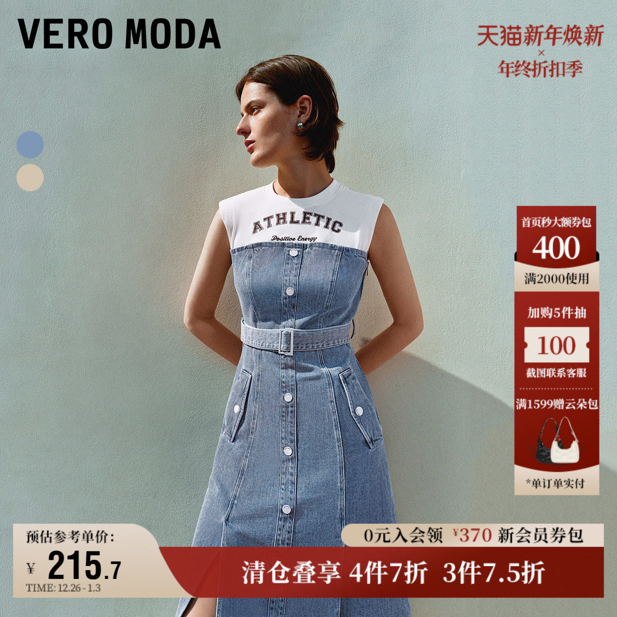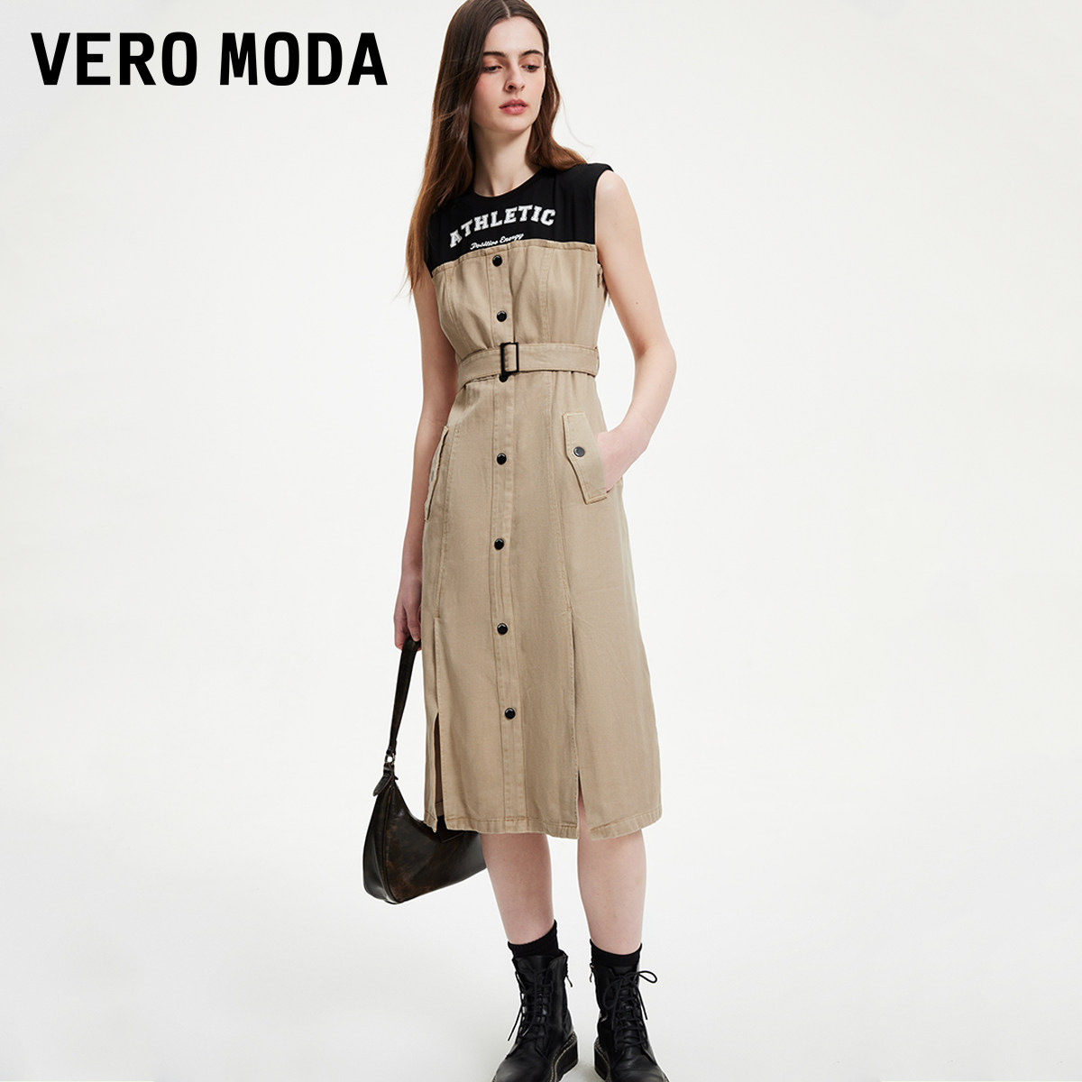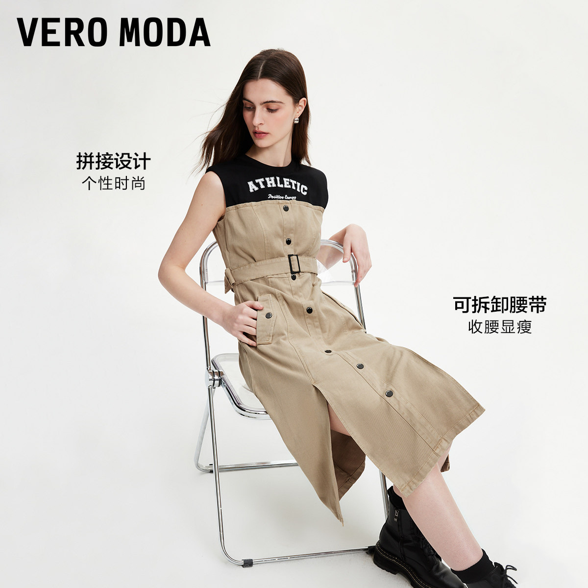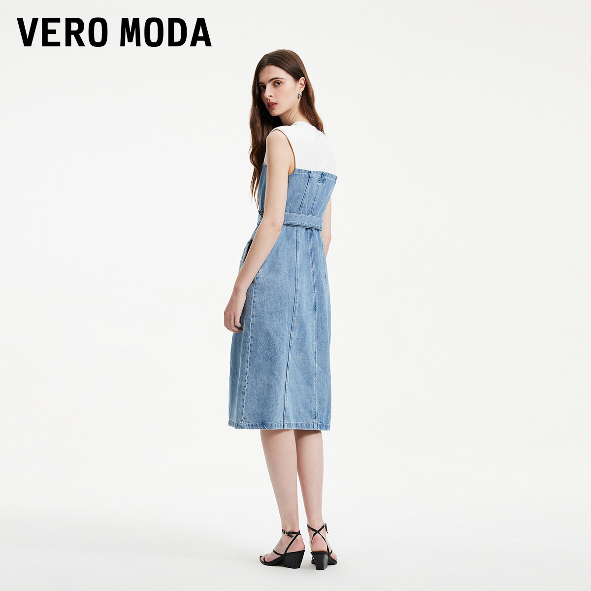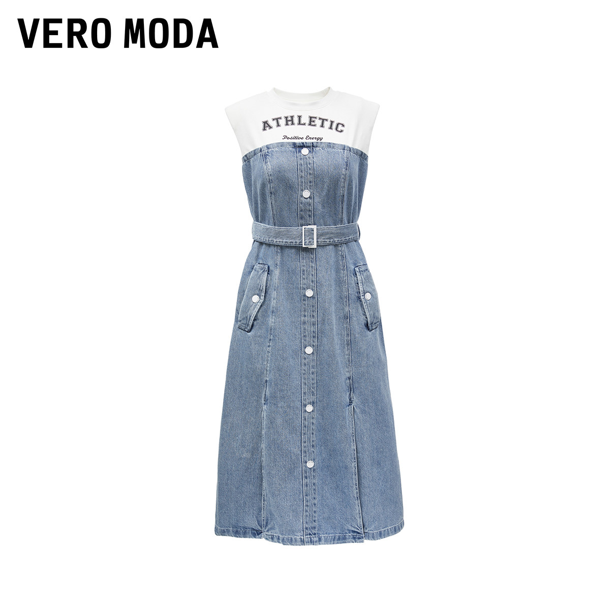 Vero Moda奥莱连衣裙夏季新款圆领拼接牛仔长裙开叉时尚街头裙子