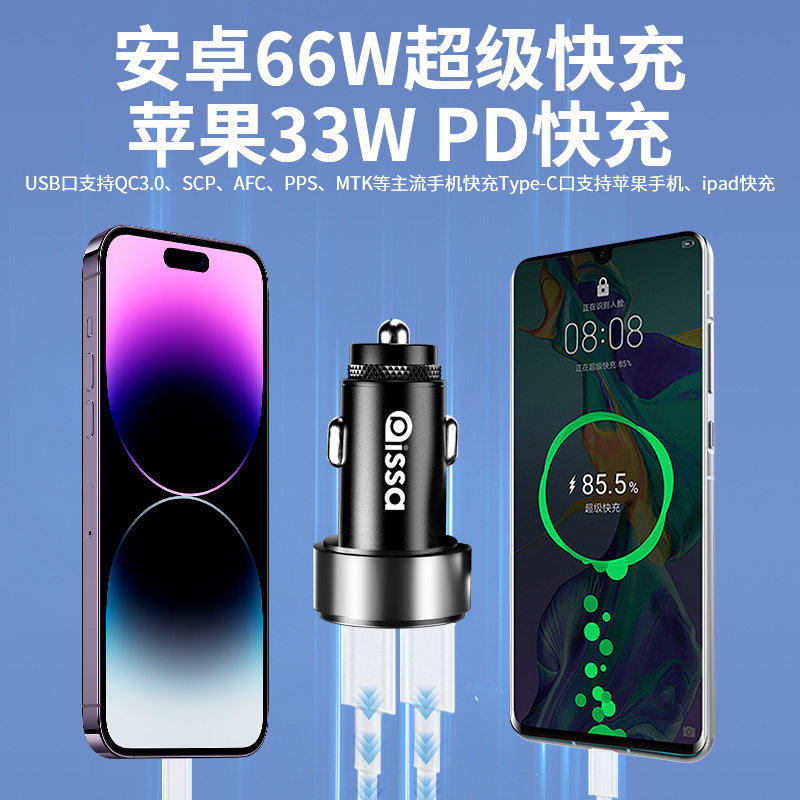 倍思车载充电器快充一拖二车充自带PD双线汽车点烟器适用苹果华为