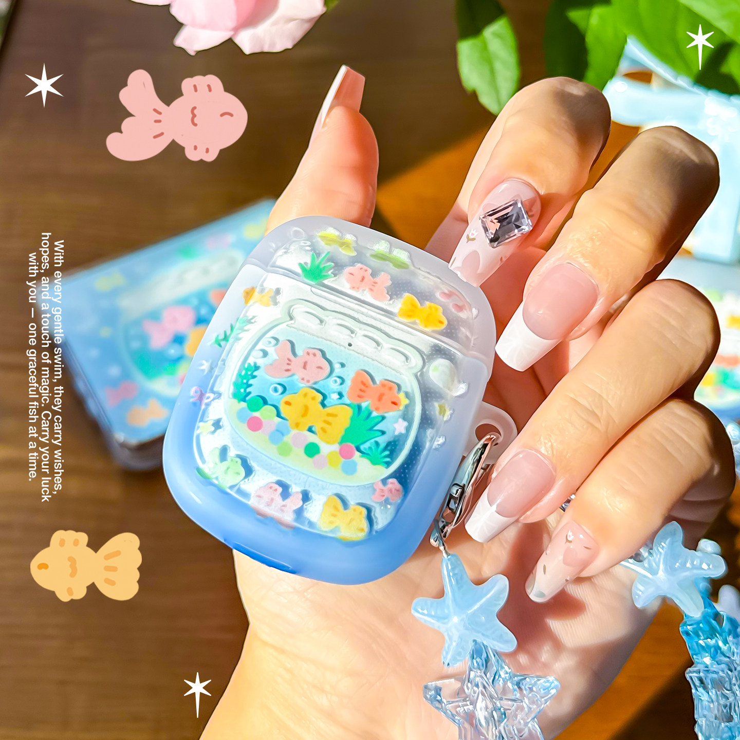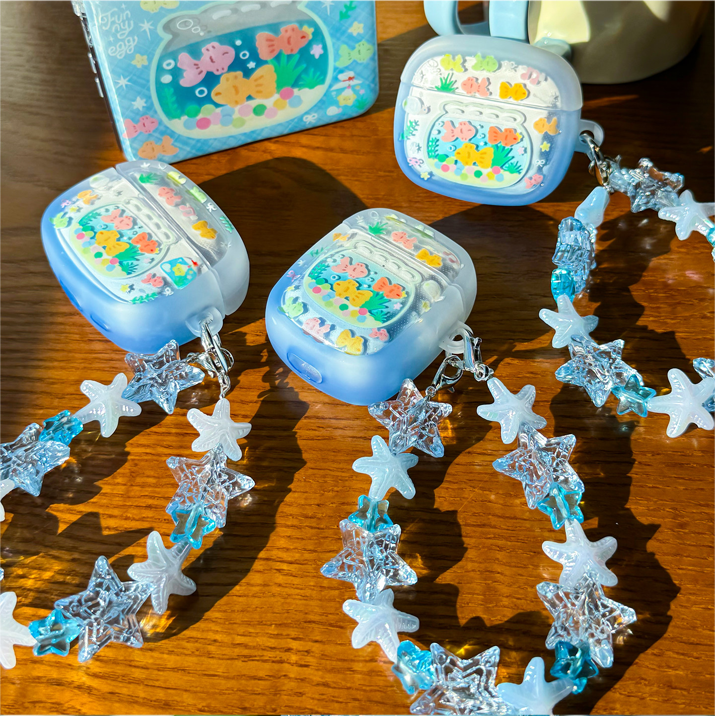 半熟玉子商店原创鱼缸好运金鱼airpods保护套适用AirPods3代4代6代pro2苹果耳机套链条清爽蓝色渐变色软壳女