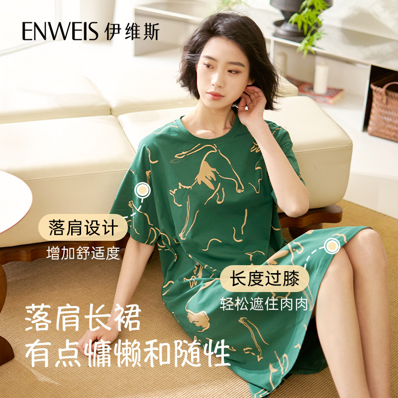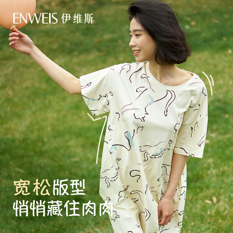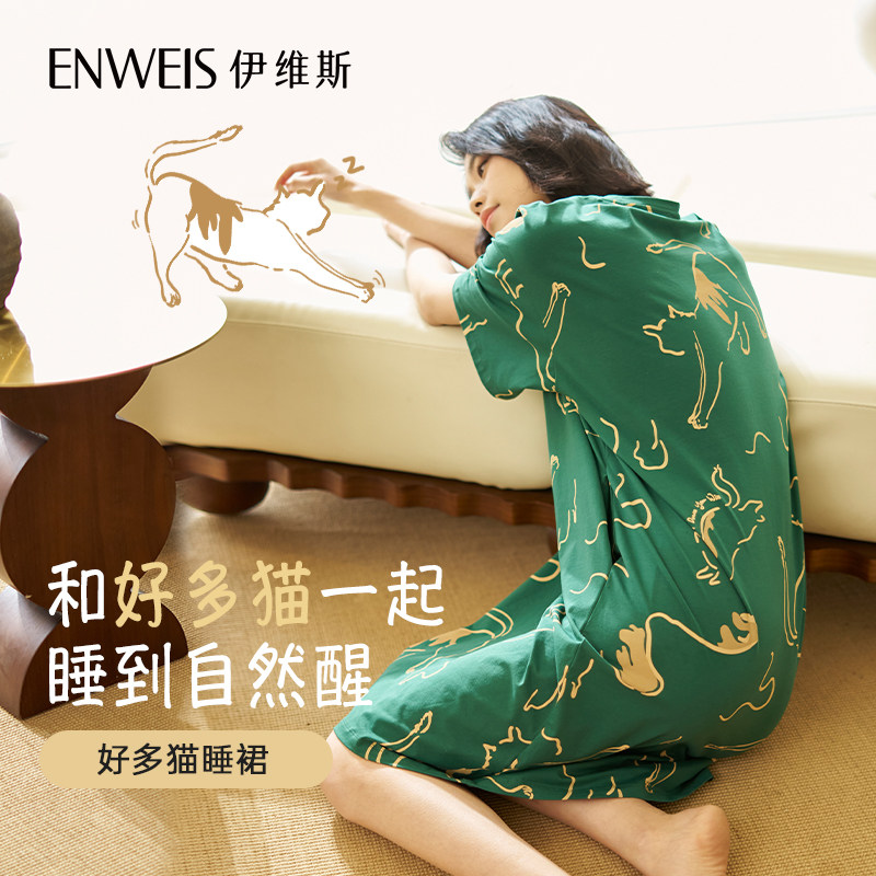 伊维斯好多猫睡裙 宽松短袖印花家居服睡衣女秋季新款