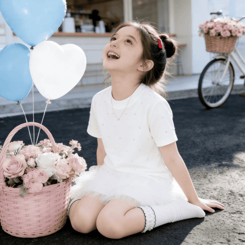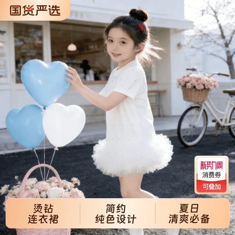 韩版女童法式烫钻短袖T恤连衣裙夏季洋气甜美女孩网纱圆领蓬蓬裙