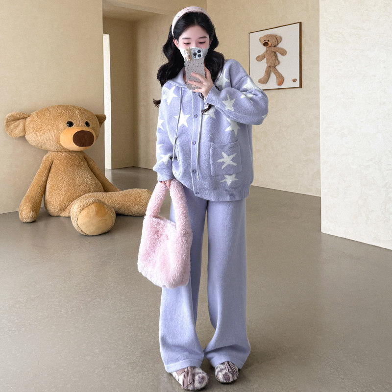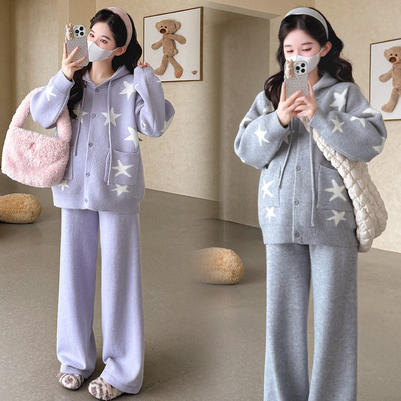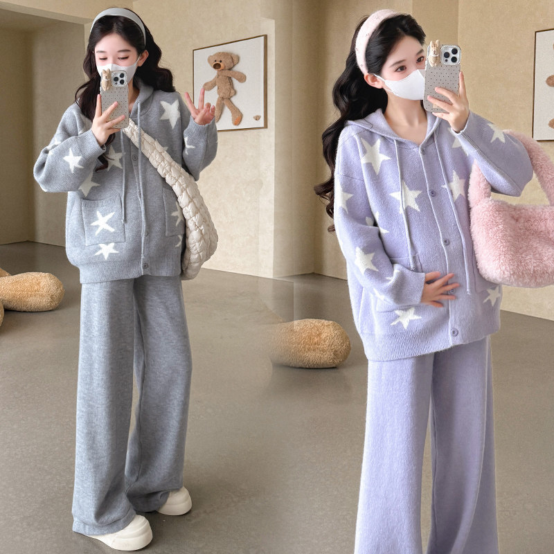 婧麒孕妇套装秋冬款2025新款宽松慵懒风连帽假两件上衣开衫两件套