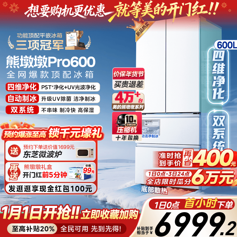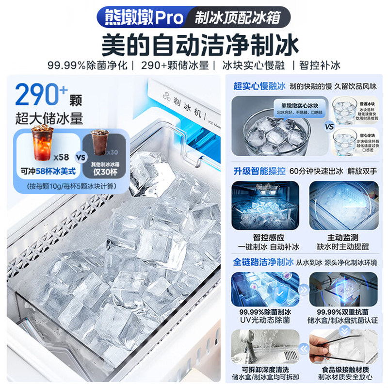 【洁净制冰】美的熊墩墩Pro600双系统零嵌超薄冰箱法式双开门家用