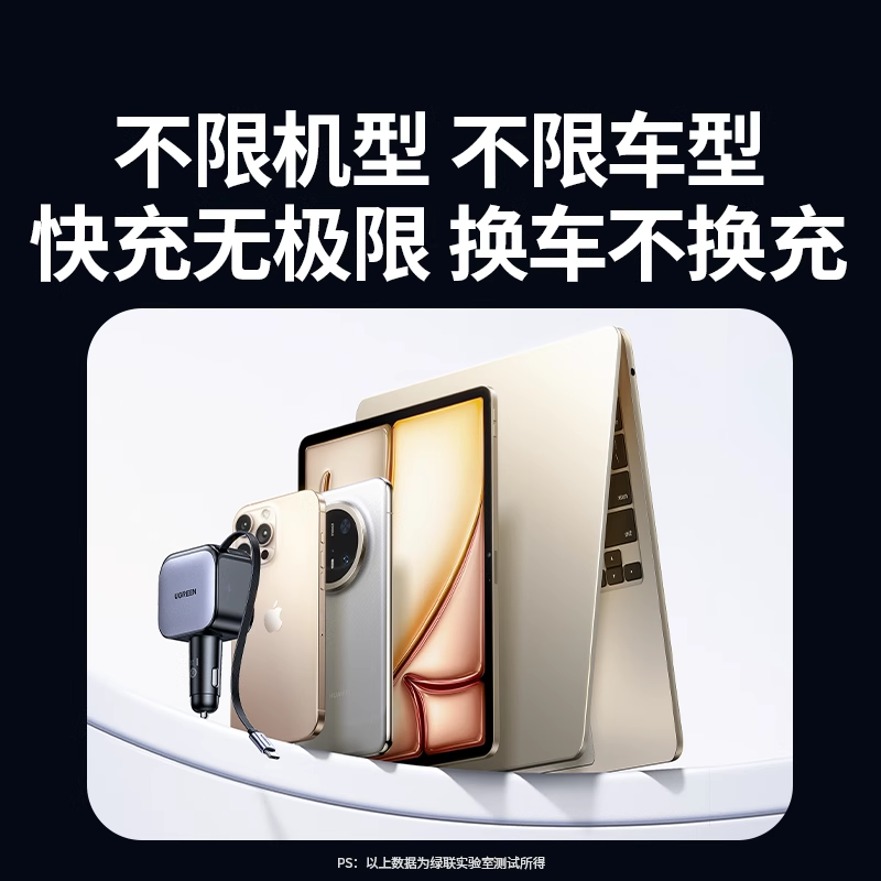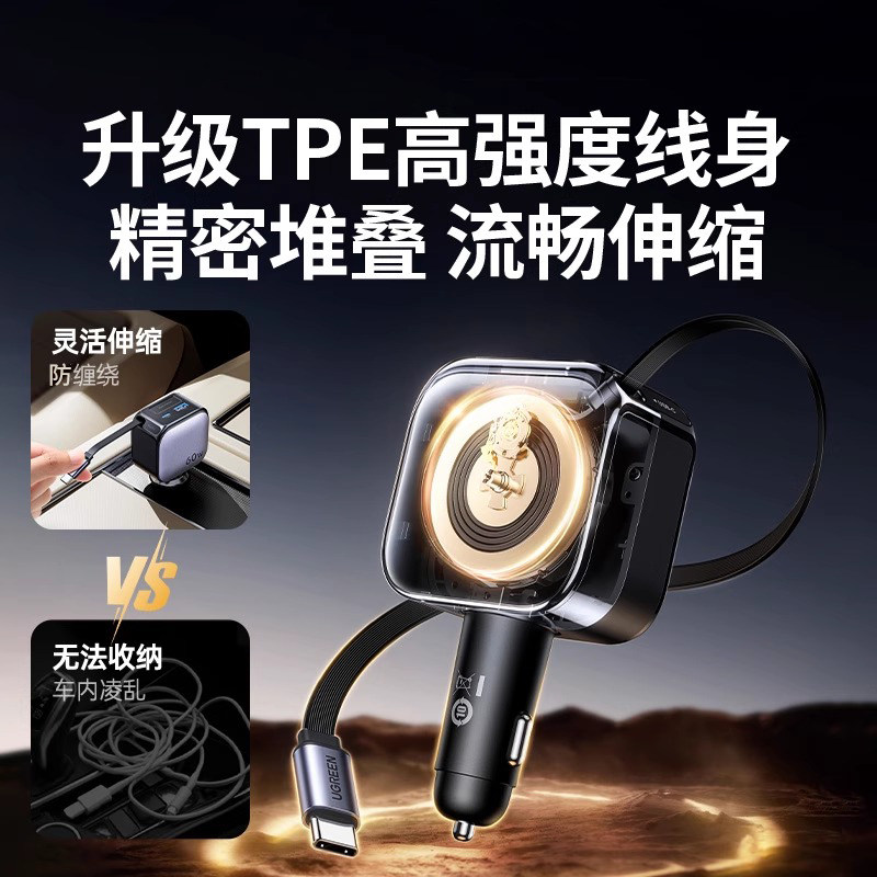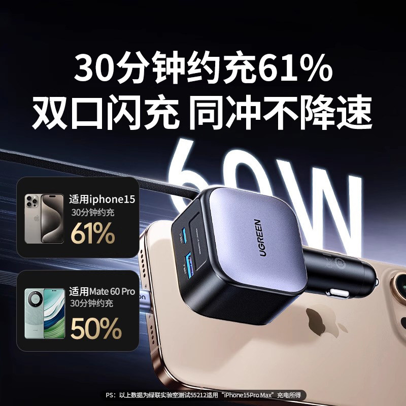 绿联车载充电器自带伸缩线60W适用于iPhone汽车充超级快充点烟器