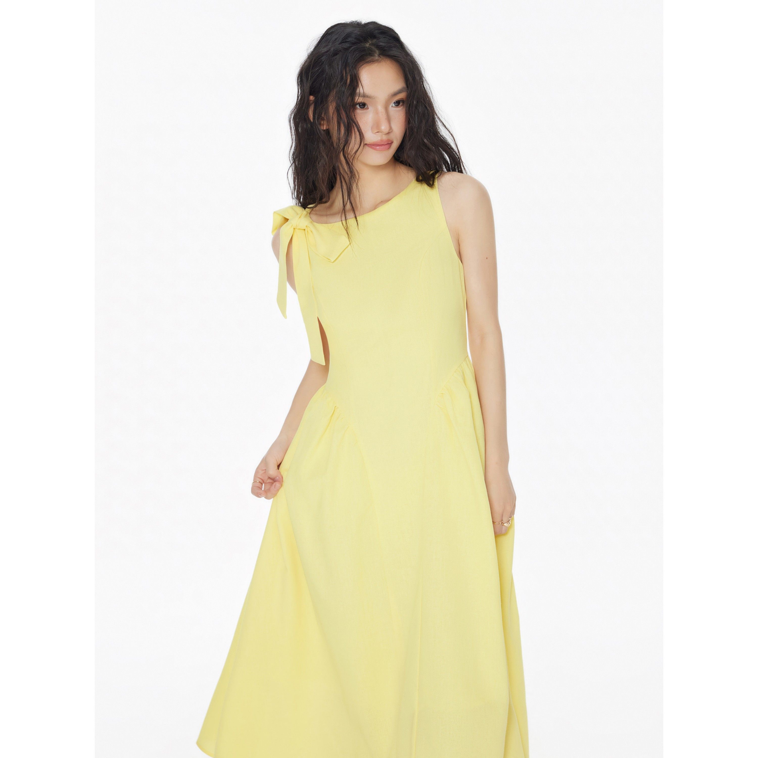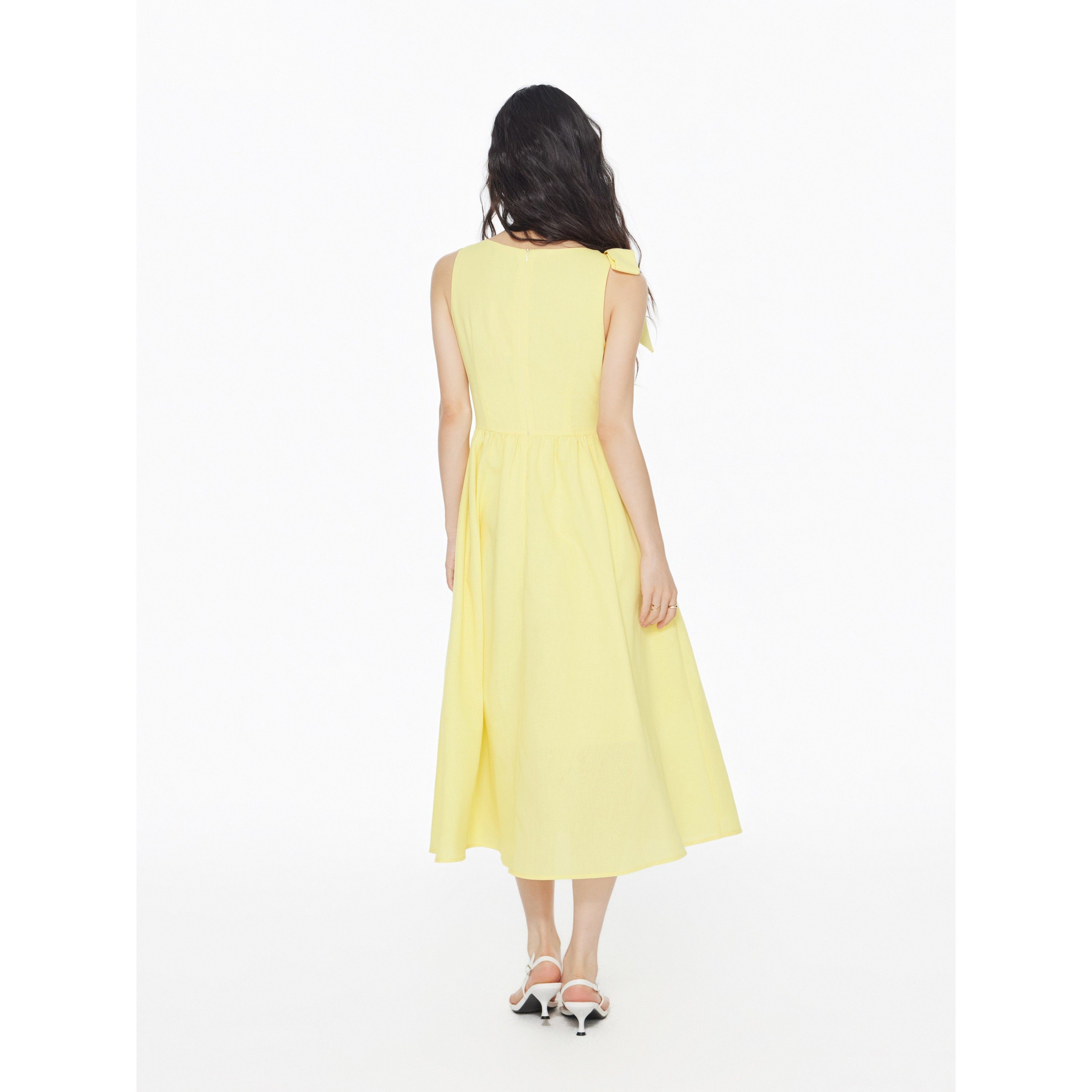 CIDER 夏季女装亚麻船领蝴蝶结褶边中长连衣裙114418223