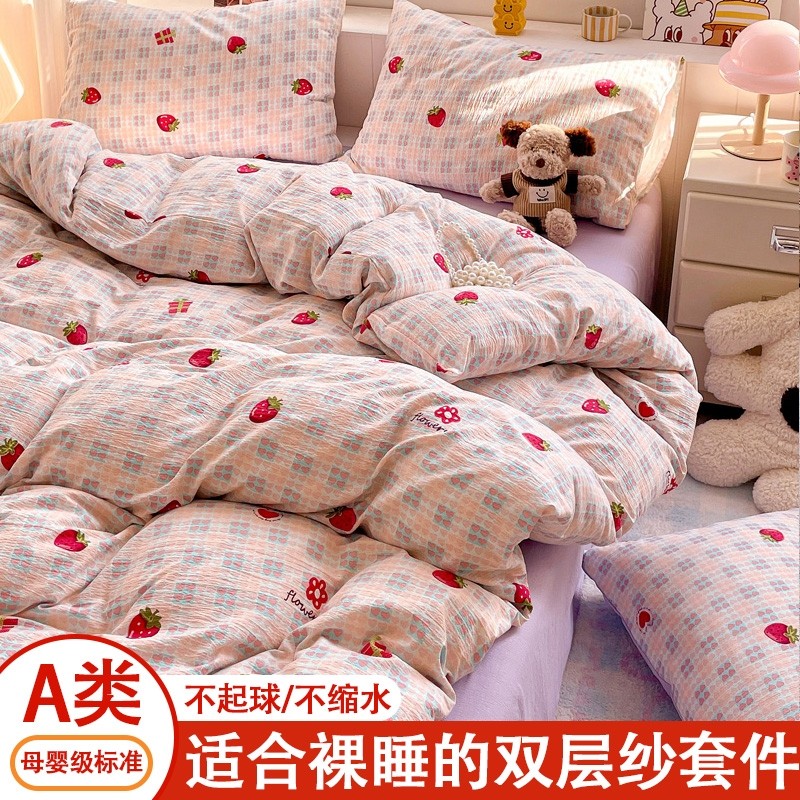 A类水洗棉双层纱四件套被罩非全棉纯棉床单人学生宿舍被套三件套