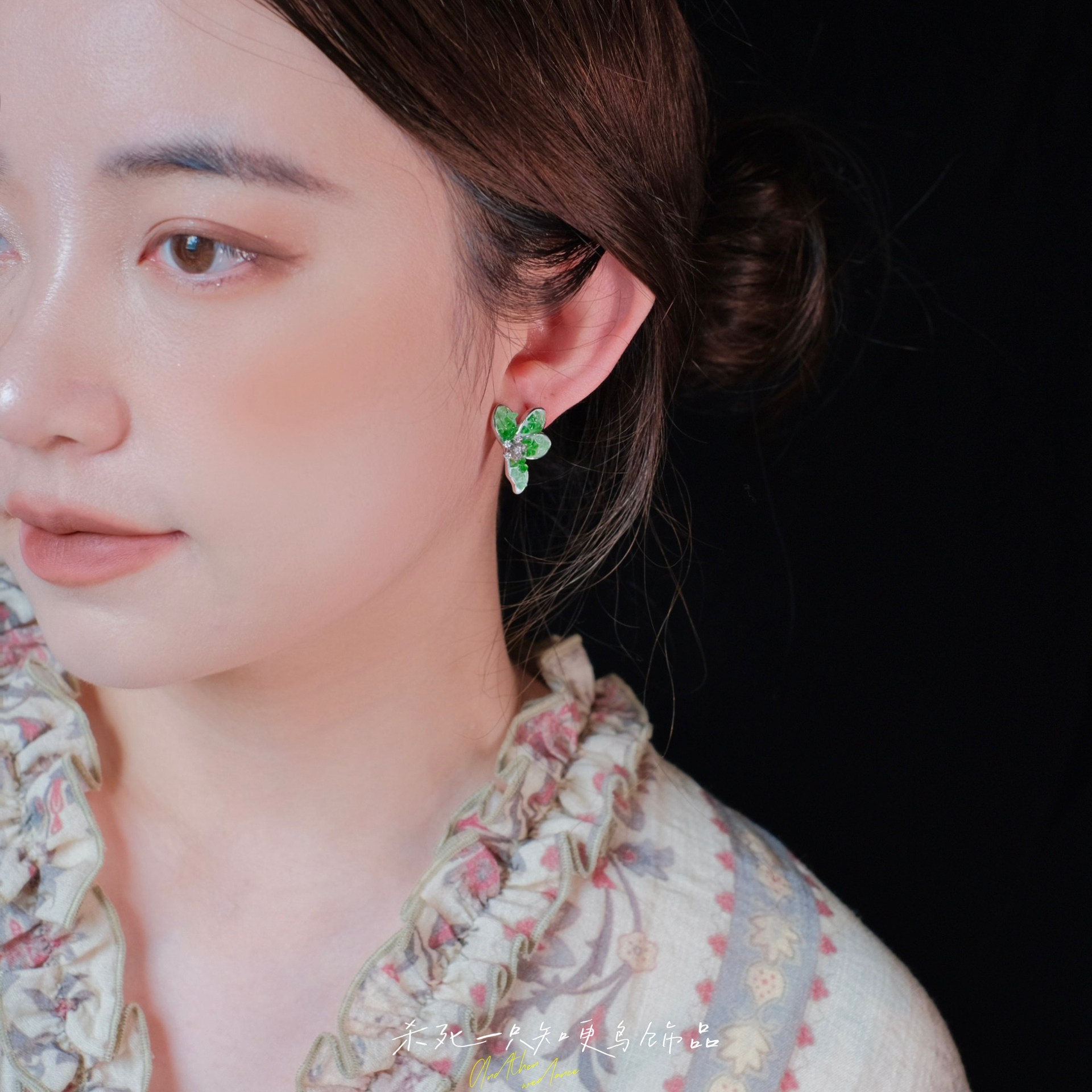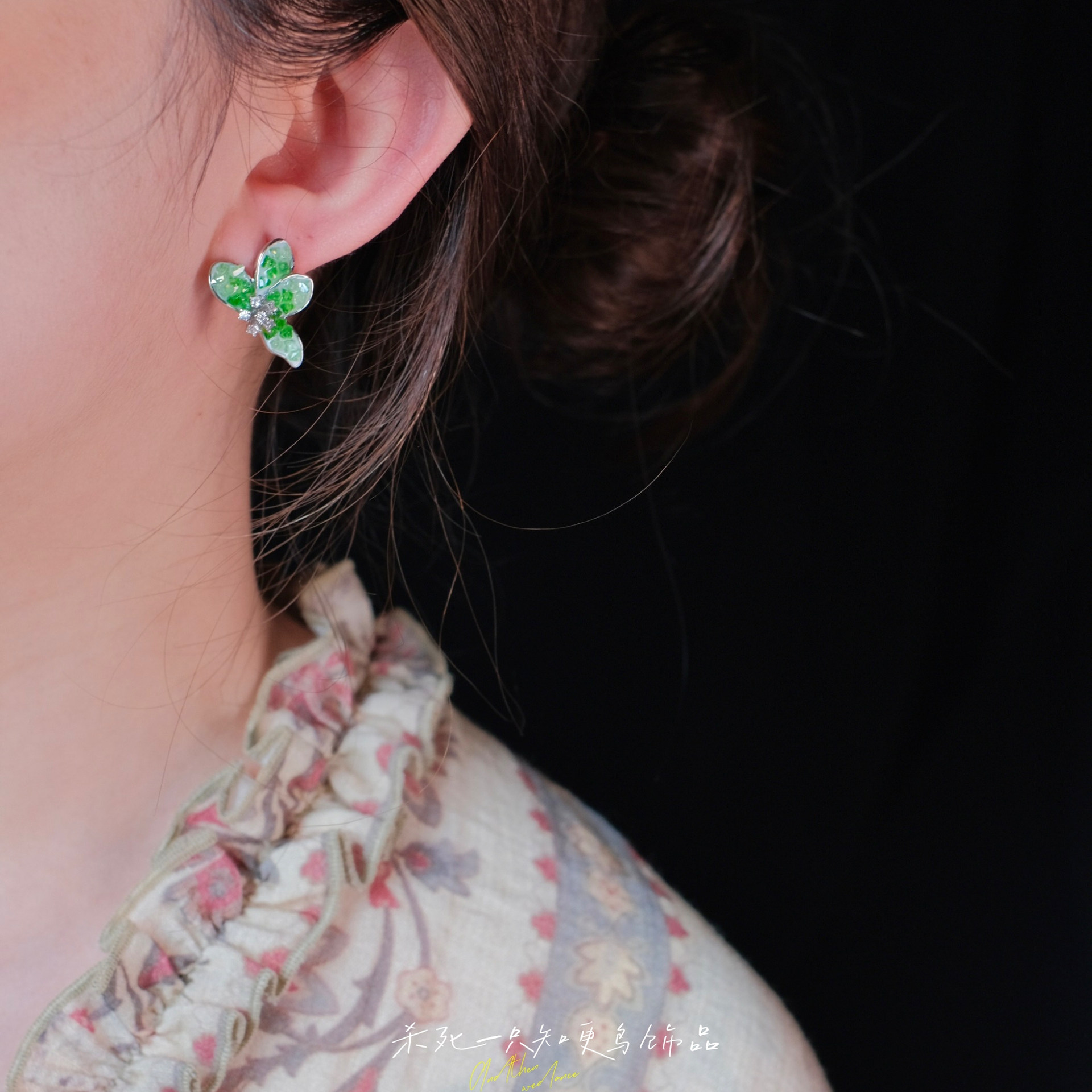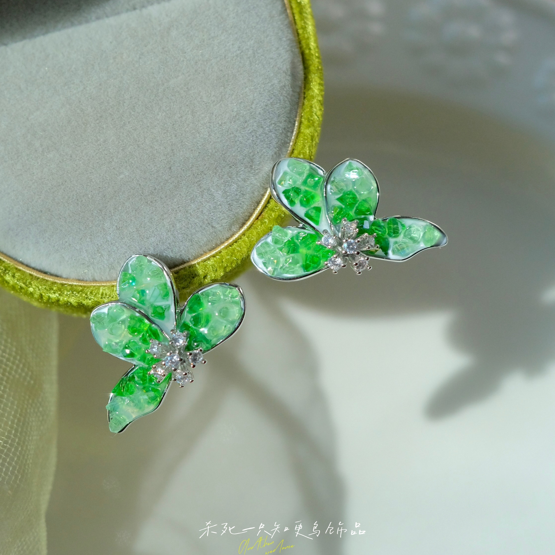 《龙井问茶》清冷感绿色仙气夏天精致高级感水晶花朵耳钉耳夹耳环