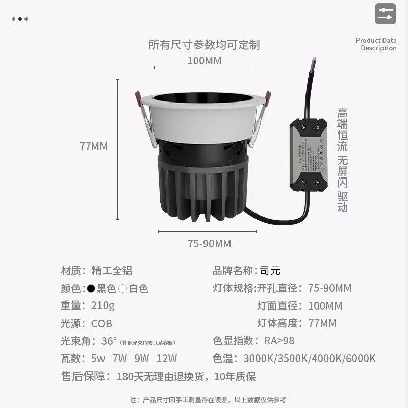 射灯LED天花灯小山丘嵌入式超亮家用COB筒灯7W可调商用聚光孔灯