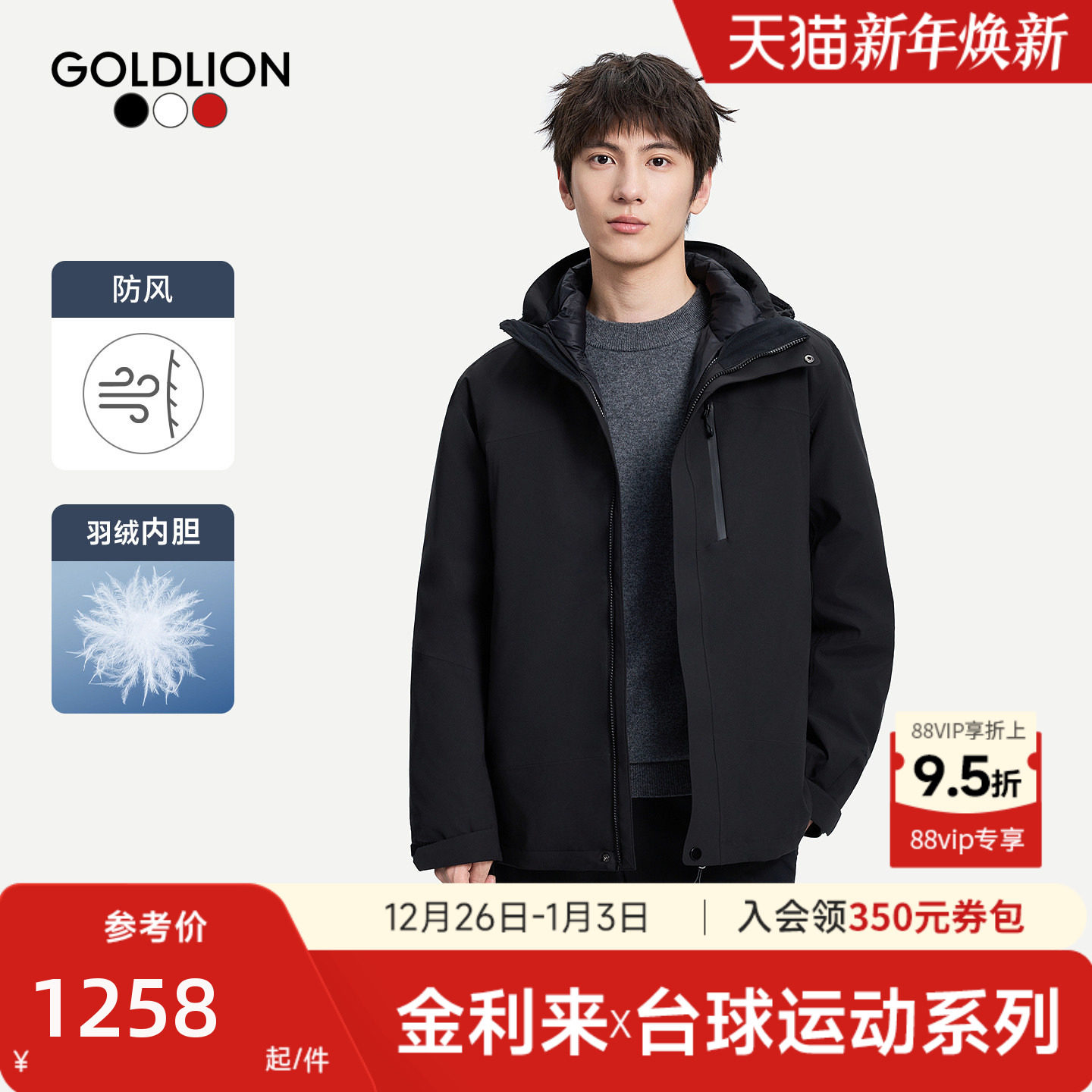 【台球运动系列】金利来25秋冬男士保暖三合一可拆卸帽羽绒服内胆
