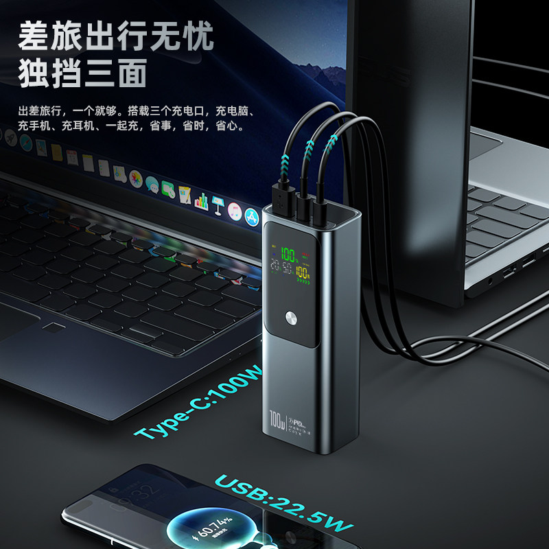 3C认证氮化镓100W充电宝大容量超级快充适用华为荣耀小米88W/100瓦笔记本电脑ipda平板可携程登记20000毫安