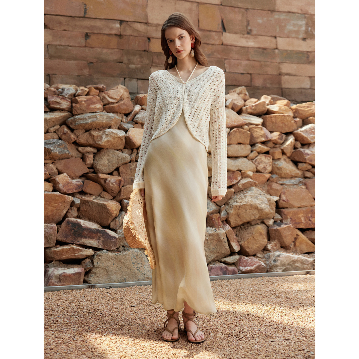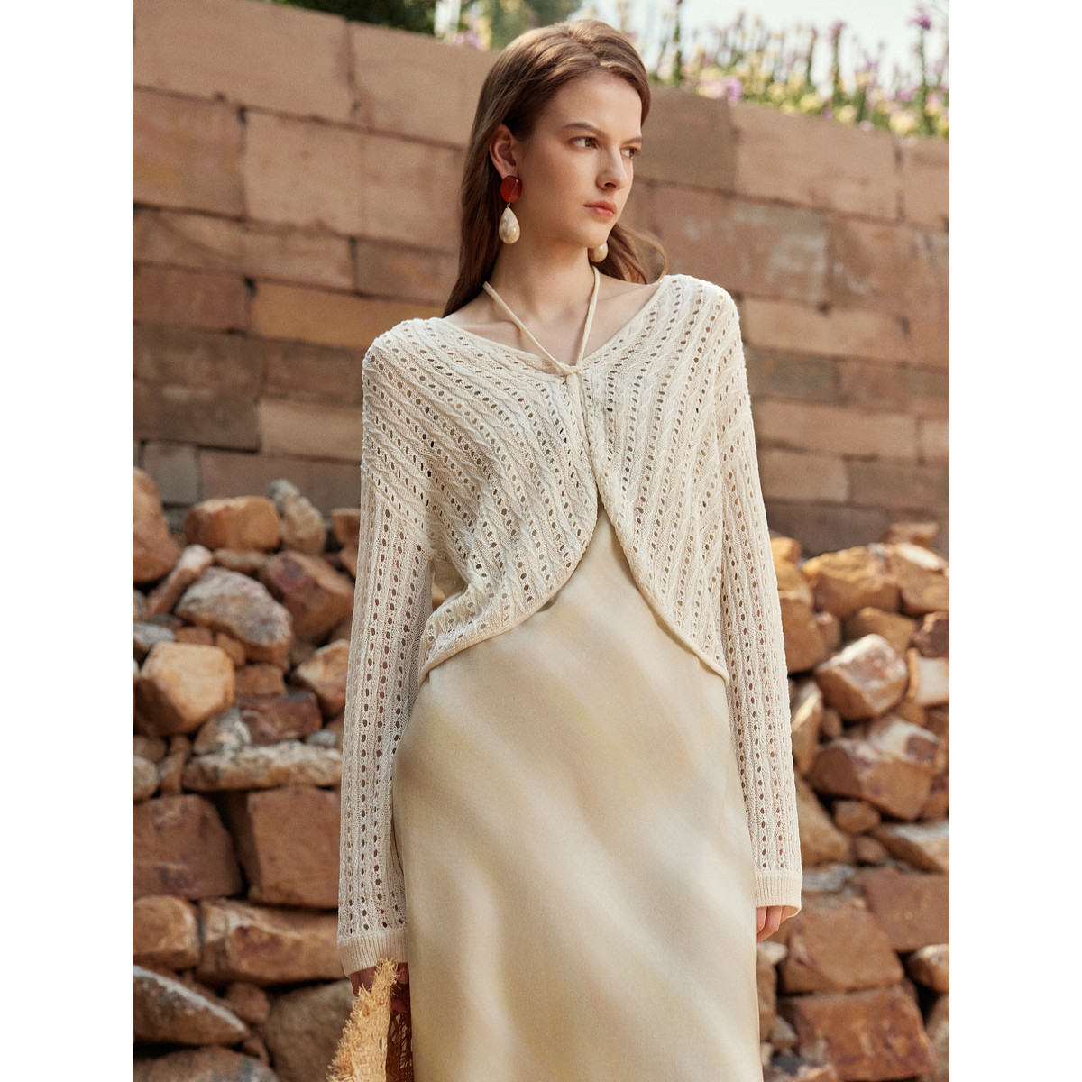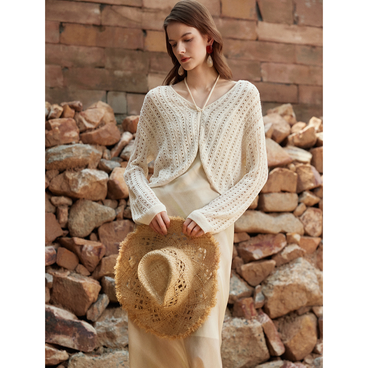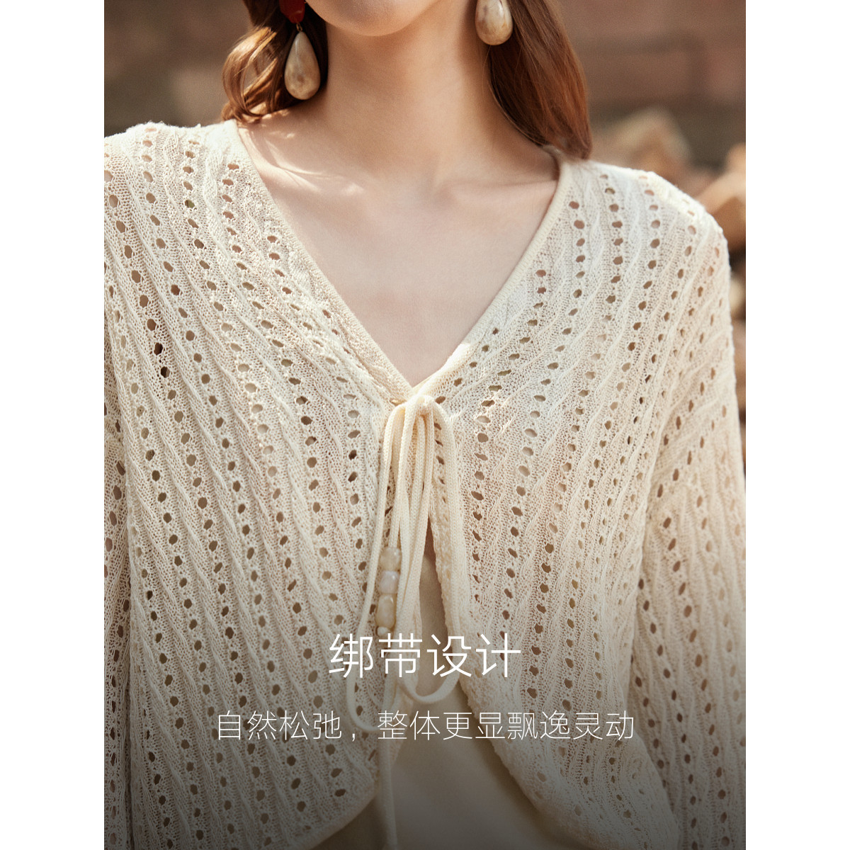 ELLE波西米亚贝壳式针织开衫女2025夏季新款薄款镂空V领时髦上衣