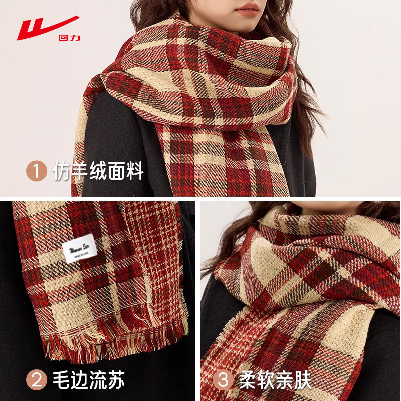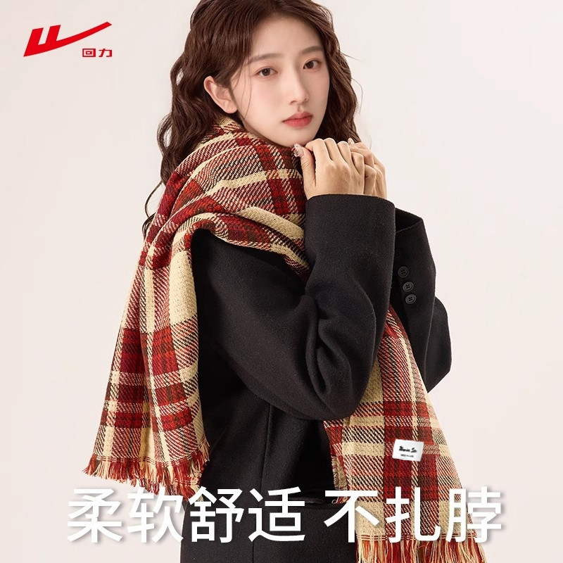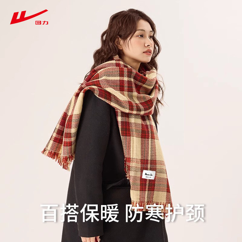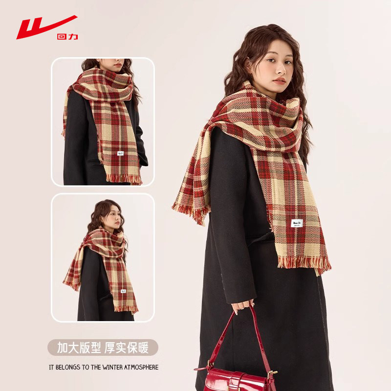 回力红色格子围巾女秋冬季经典英伦复古韩版双面围脖加厚氛围软糯