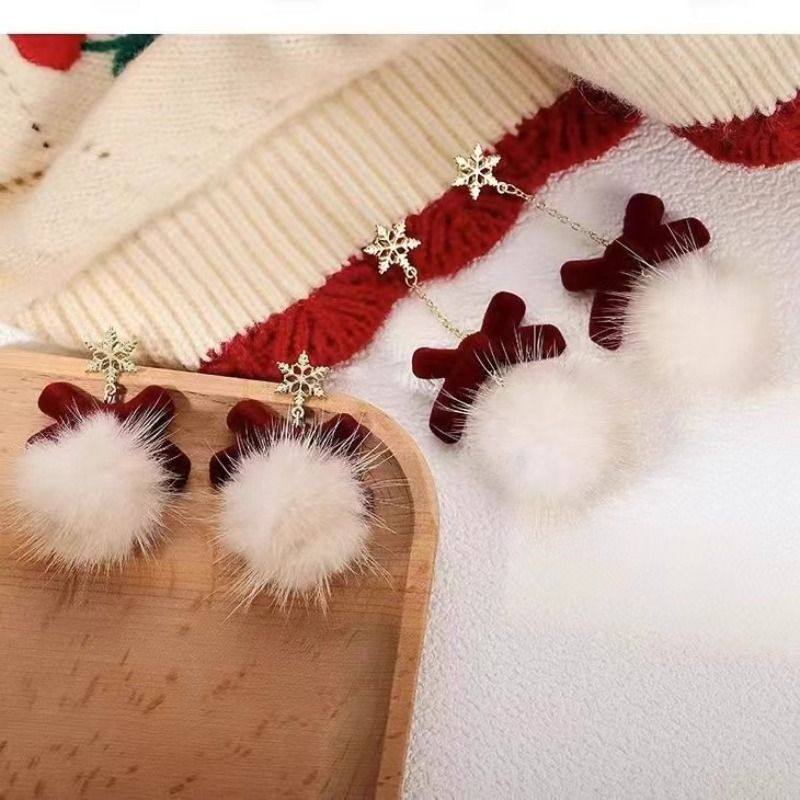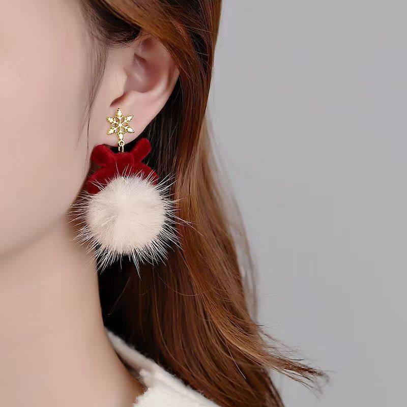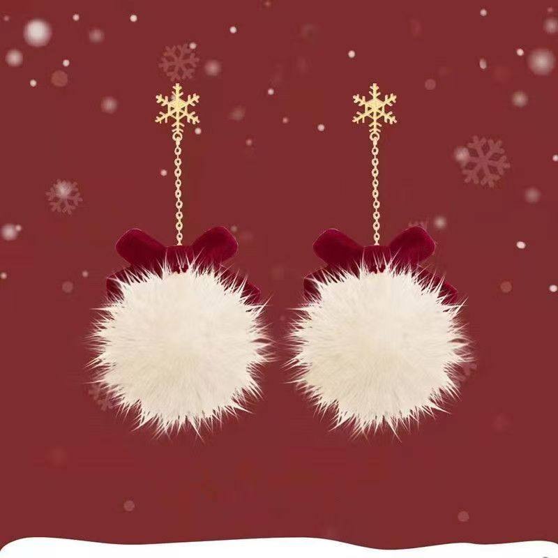 圣诞耳饰秋冬毛茸茸新款红色蝴蝶结耳钉女新年毛绒绒耳环