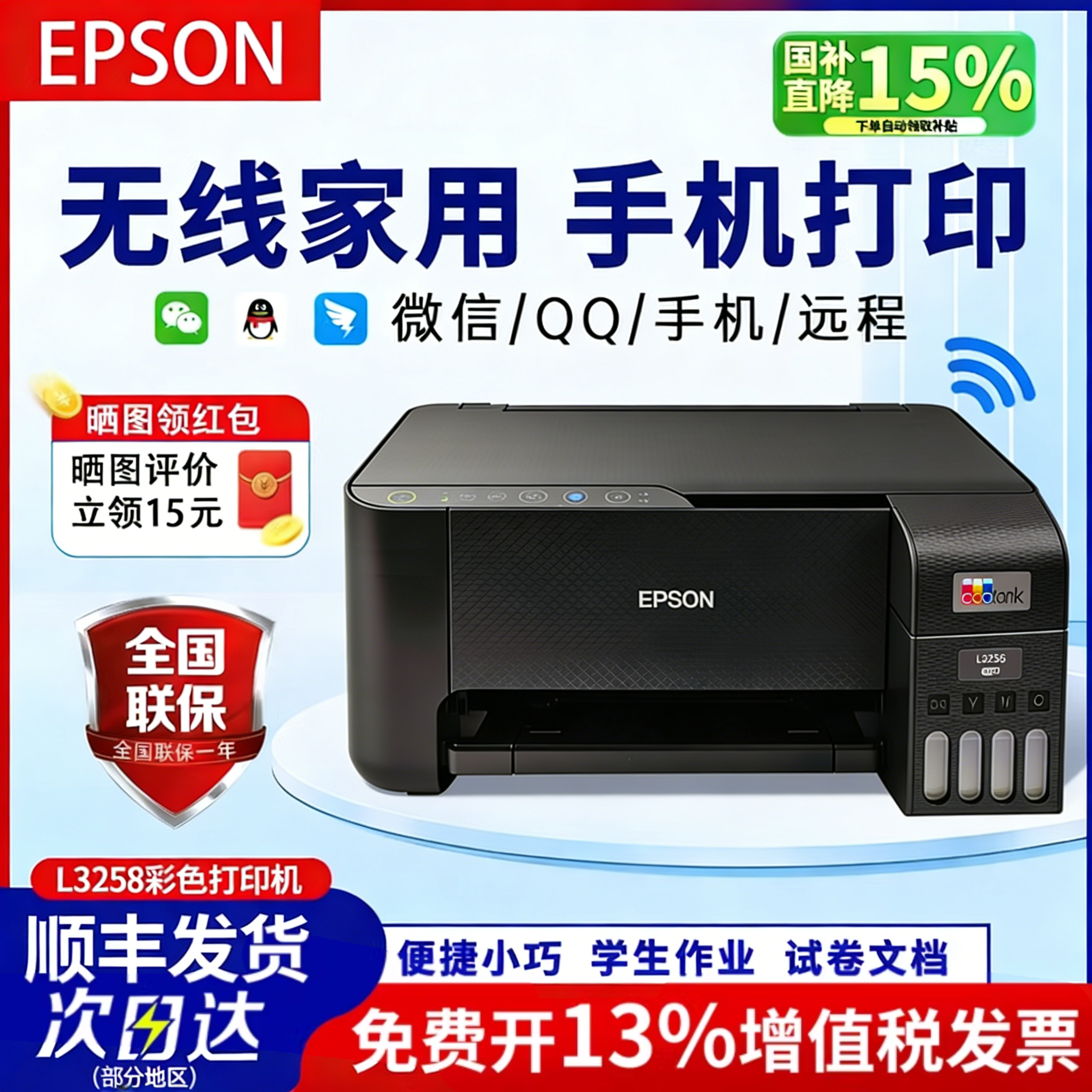 爱普生L3258L3256L3556L3558L4269彩色打印机小型家用手机远程支持无线WiFi微信打印复印扫描政府补贴15%