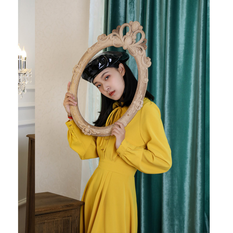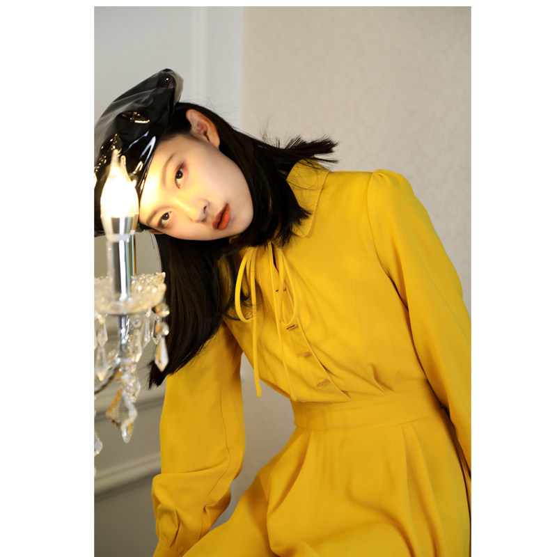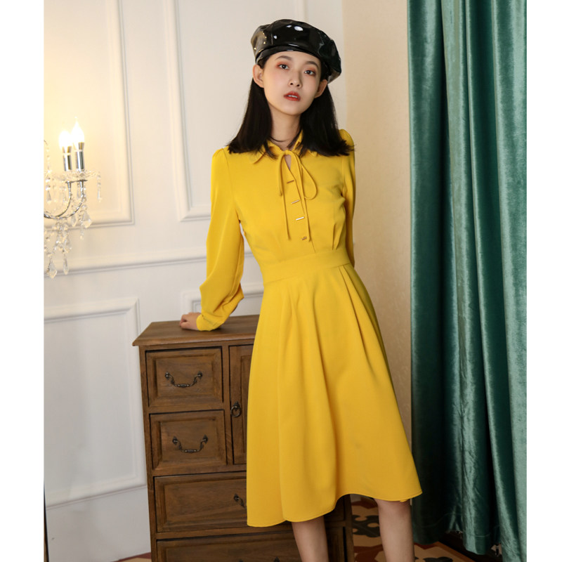 春季新款黄色连衣裙法式复古收腰显瘦长袖裙子小个子系带裙甜美女