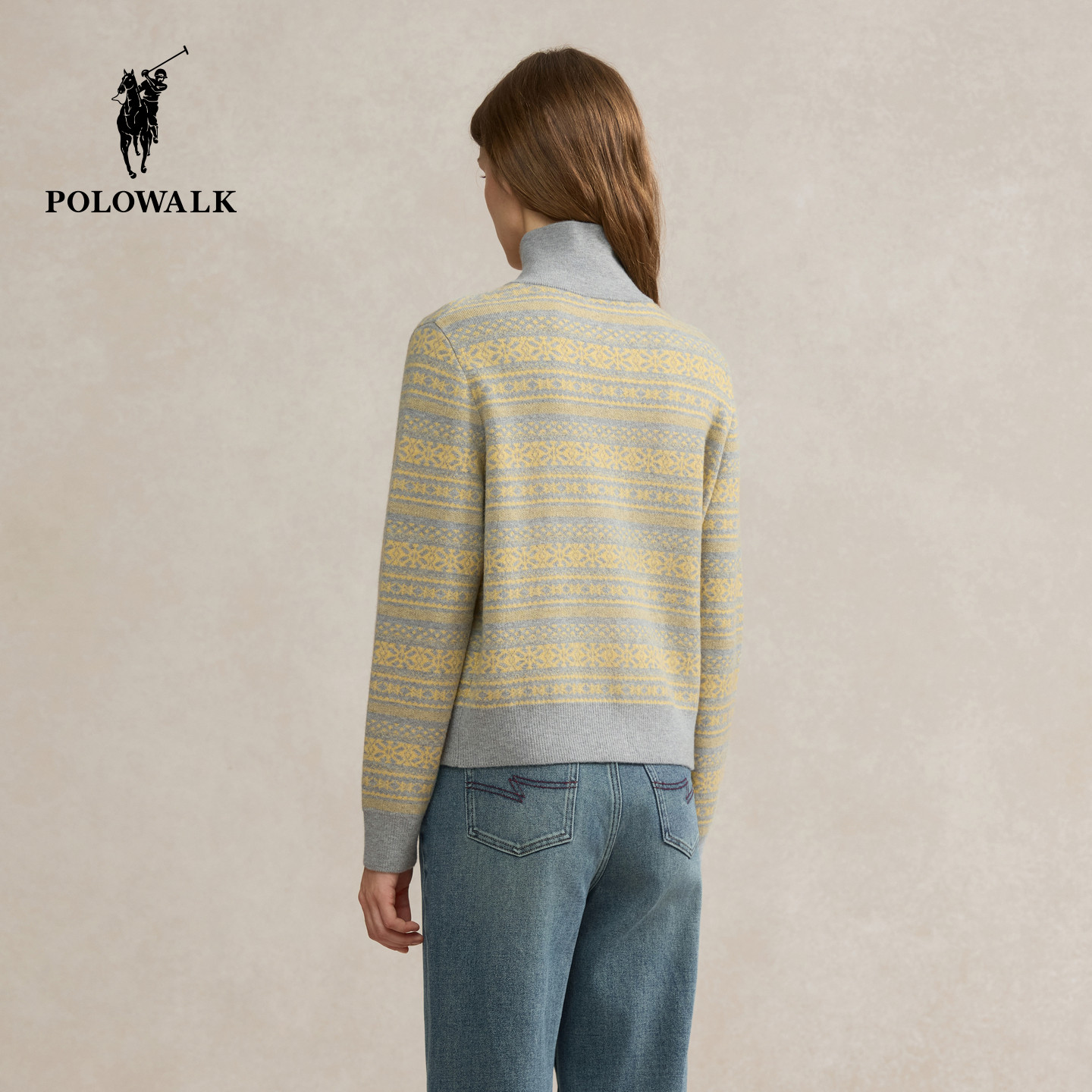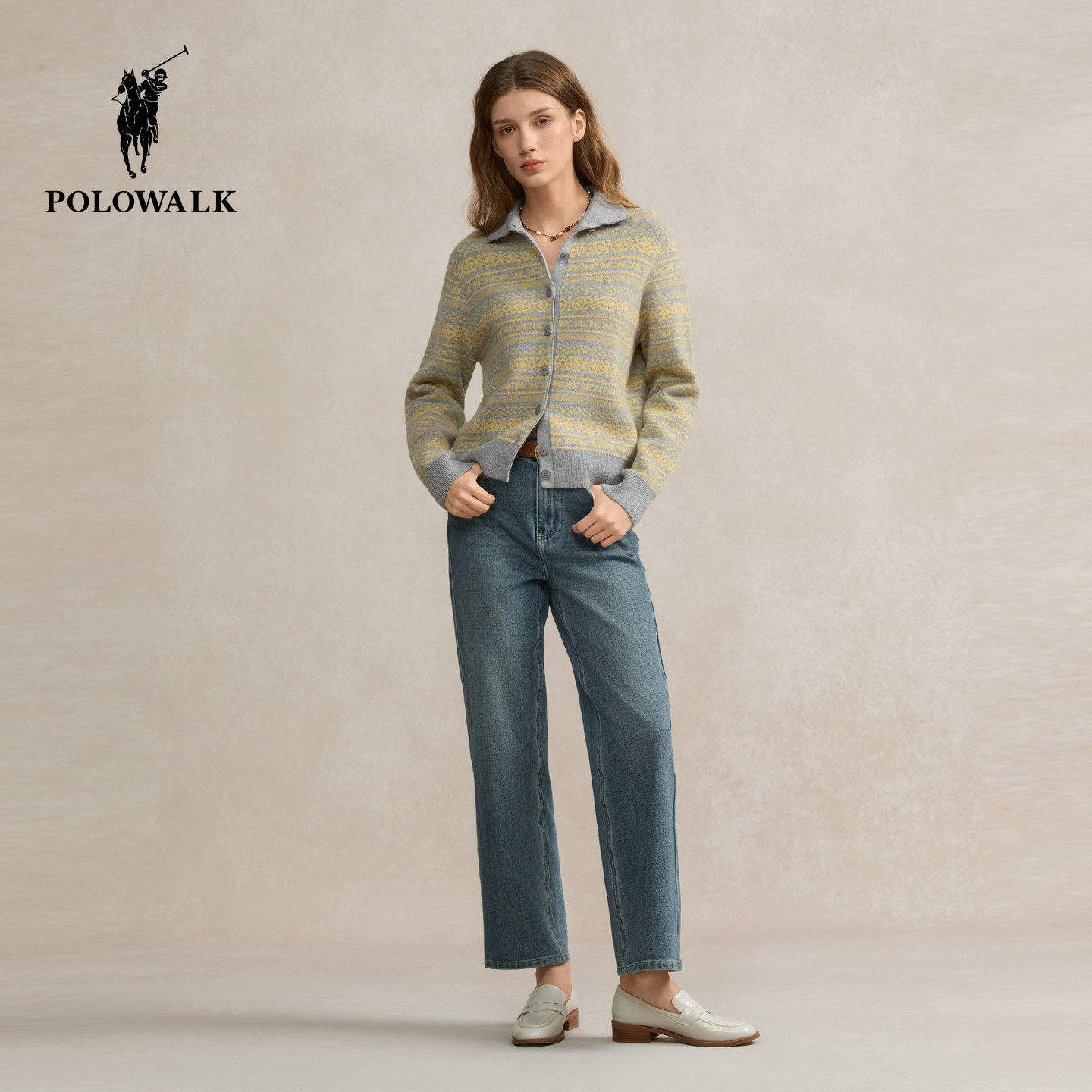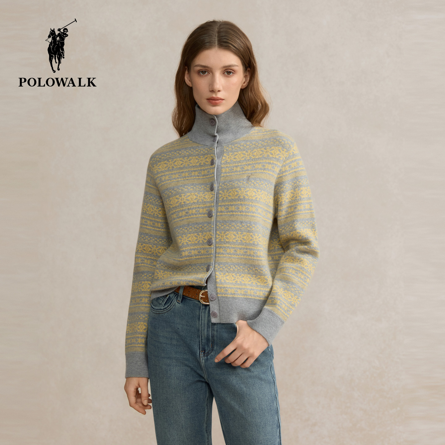 POLOWALK女式长袖针织衫2025冬季新品时尚撞色提花显瘦针织开衫