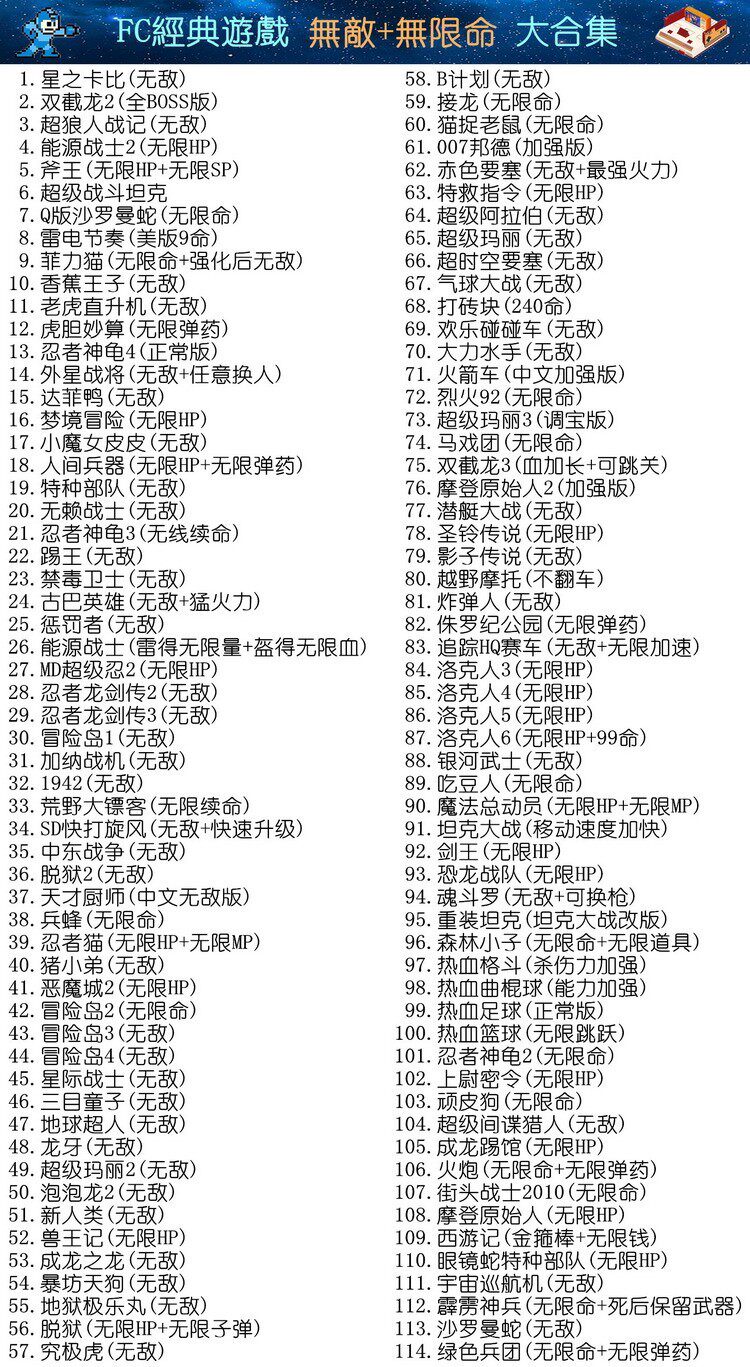 FC任天堂游戏卡带8位黄卡114合一无限命无敌合集小霸王hack合卡1
